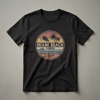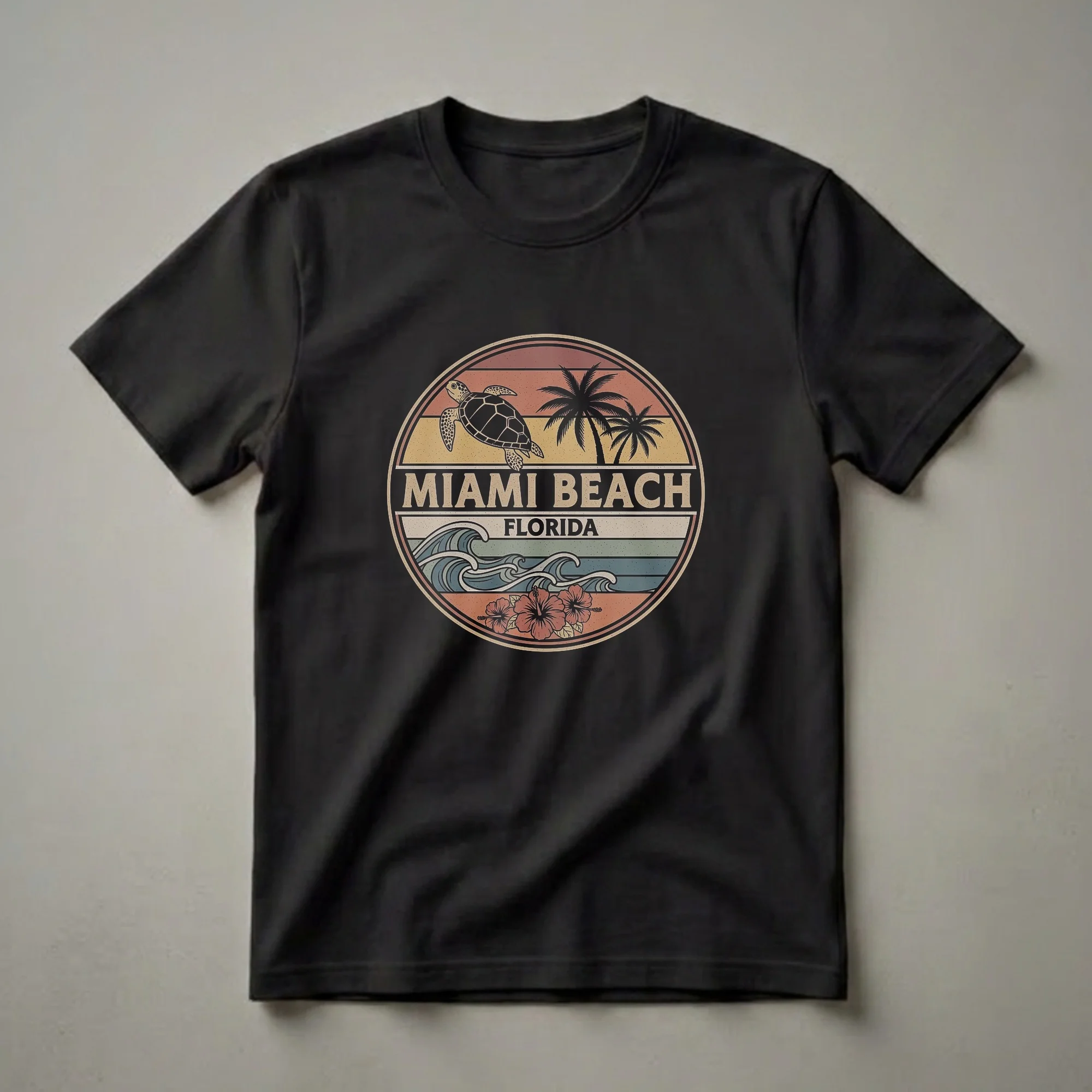 Miami Beach, Florida, conjures images of sun-drenched shores, vibrant culture, and the gentle rhythm of the ocean. This graphic tee embodies that spirit with a striking retro design. Dominating the circular artwork is a sea turtle, a creature synonymous with marine life found in the warm waters off the Florida coast. Above, silhouetted palm trees sway against a sunset-hued sky, a classic symbol of tropical destinations. The text proudly proclaims "MIAMI BEACH FLORIDA," grounding the design in its specific location. Below, stylized waves crash onto the shore, hinting at the Atlantic's embrace, while a cluster of hibiscus flowers adds a touch of vibrant, tropical flora. This t-shirt is a go-to for anyone who cherishes memories of the Magic City or dreams of visiting its iconic beaches. It makes a thoughtful gift for travelers, beachcombers, or anyone who appreciates vintage-inspired Florida apparel. Wear this shirt to your next beach outing or casual gathering to showcase your love for Miami's unique coastal charm. The design's vintage color palette and textured finish evoke a sense of nostalgia, making it a standout piece for your wardrobe.