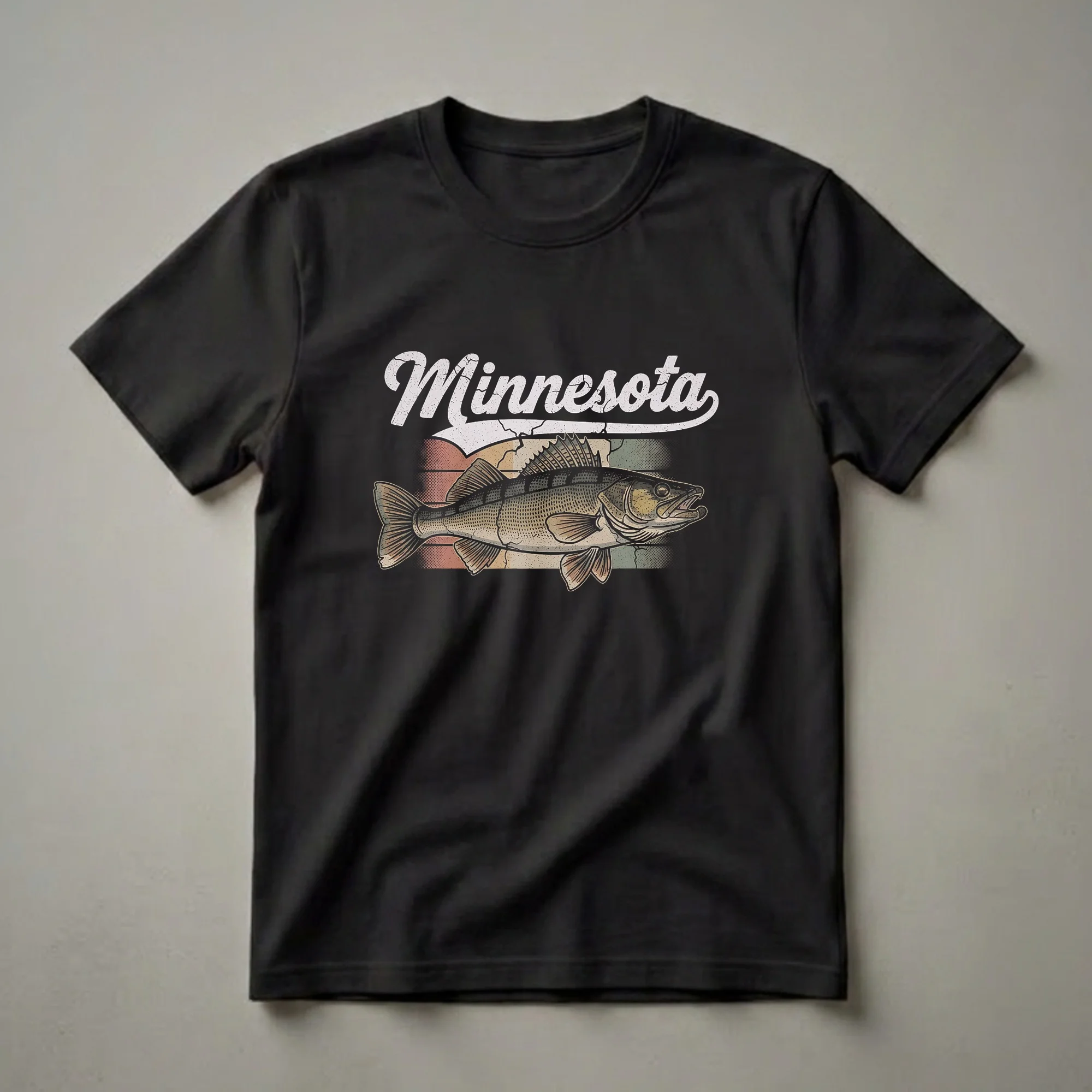 - Retro Minnesota walleye graphic t-shirt for anglers.