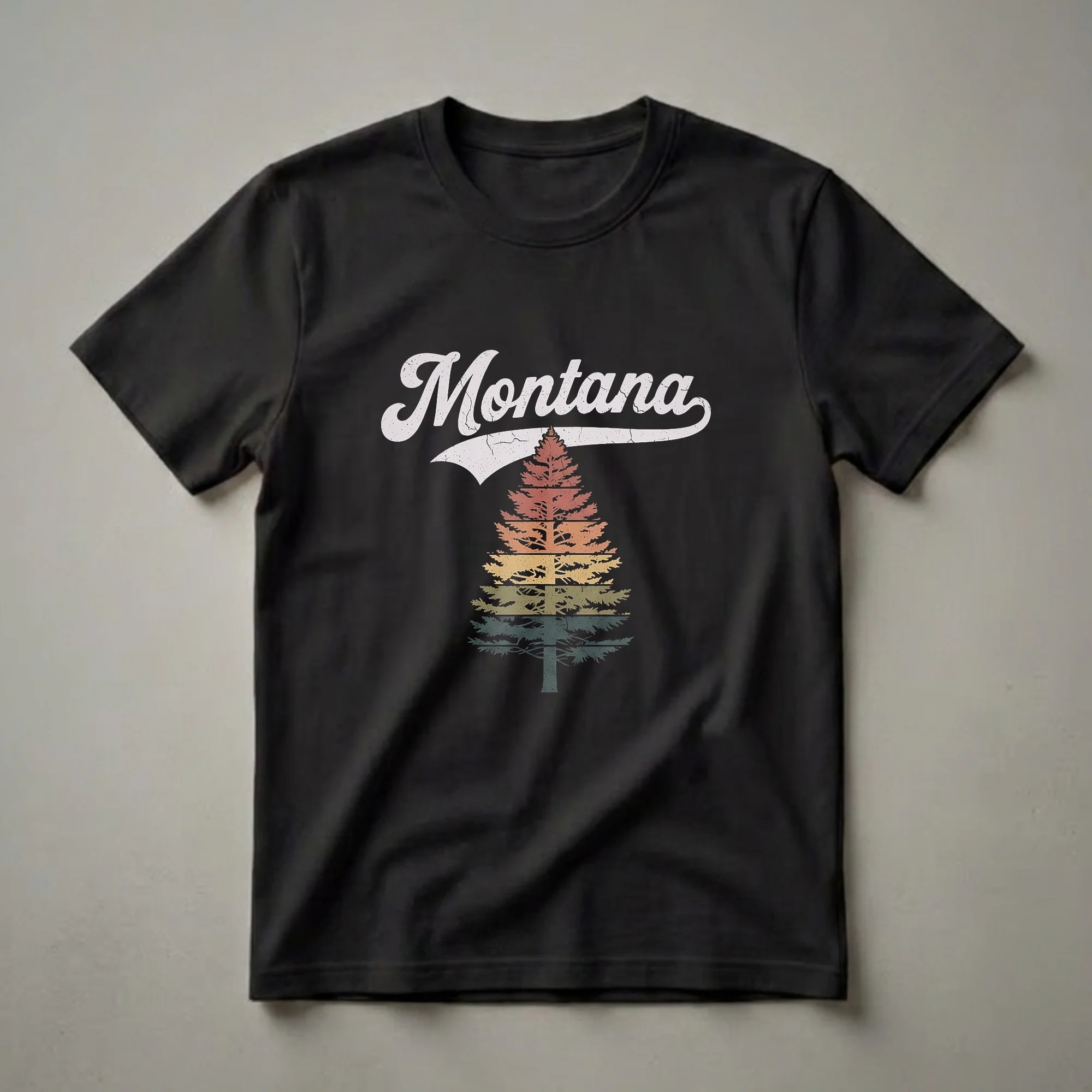Montana, known as the 'Big Sky Country,' offers vast landscapes and abundant natural beauty, making this retro graphic tee a fitting tribute for those who cherish its wilderness. The design prominently features the word 'Montana' in a classic, distressed script font, evoking a sense of nostalgia. Below the text, a stylized pine tree stands tall, rendered in horizontal bands of color that transition from a deep forest green at the base to warm sunset hues of orange and red at the top. This visual representation captures the essence of Montana's diverse ecosystems, from its dense forests to its expansive skies. This t-shirt is a thoughtful gift for anyone who has a deep connection to Montana, whether they are a resident, a frequent visitor, or simply admire its rugged charm. It's a go-to tee for casual outings, hiking trips, or simply relaxing while reminiscing about the great outdoors. Wear this shirt to express your state pride or to bring a piece of Montana's natural splendor with you wherever you go. The distressed aesthetic adds a vintage feel, making it a unique addition to any wardrobe for those who appreciate the state's natural heritage.