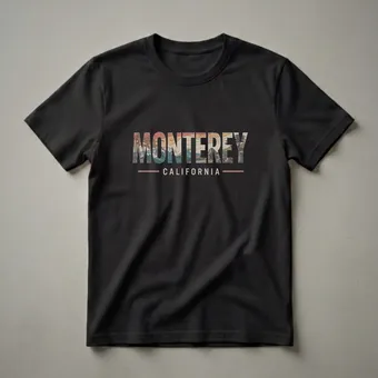 Monterey, California, a city celebrated for its stunning coastline and rich history, is captured in this unique graphic tee. The design features the word MONTEREY boldly emblazoned across the chest, with each letter artfully filled with a vibrant, retro-style depiction of the region's natural beauty. Imagine the iconic cypress trees standing sentinel on rocky shores, the majestic Pacific waves crashing onto the beach, and the warm glow of a setting sun casting long shadows over the rolling hills. Below, CALIFORNIA grounds the design, reinforcing its West Coast roots. This t-shirt is a thoughtful gift for anyone who has fond memories of visiting Monterey, whether it's for the world-renowned aquarium, the scenic 17-Mile Drive, or simply the captivating ocean views. It's a staple in the collection for those who appreciate vintage travel aesthetics and want to carry a piece of the California coast with them. This shirt works well for casual outings, beach trips, or as a conversation starter among fellow travelers and California enthusiasts. Wear it to remember your last vacation or to inspire your next adventure along the Pacific coast.