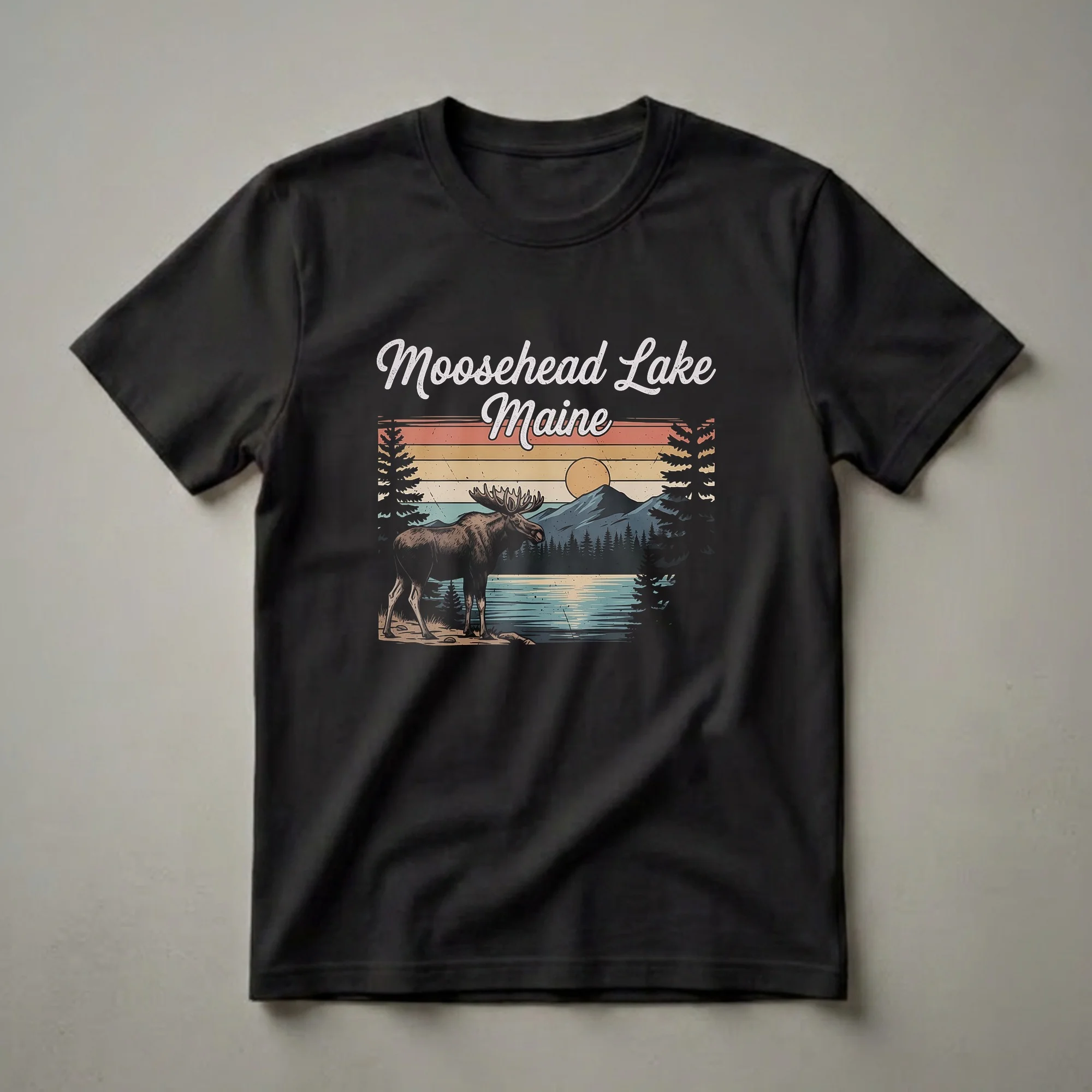 - Retro graphic tee showcasing a bull moose on the shores of Moosehead Lake, Maine.