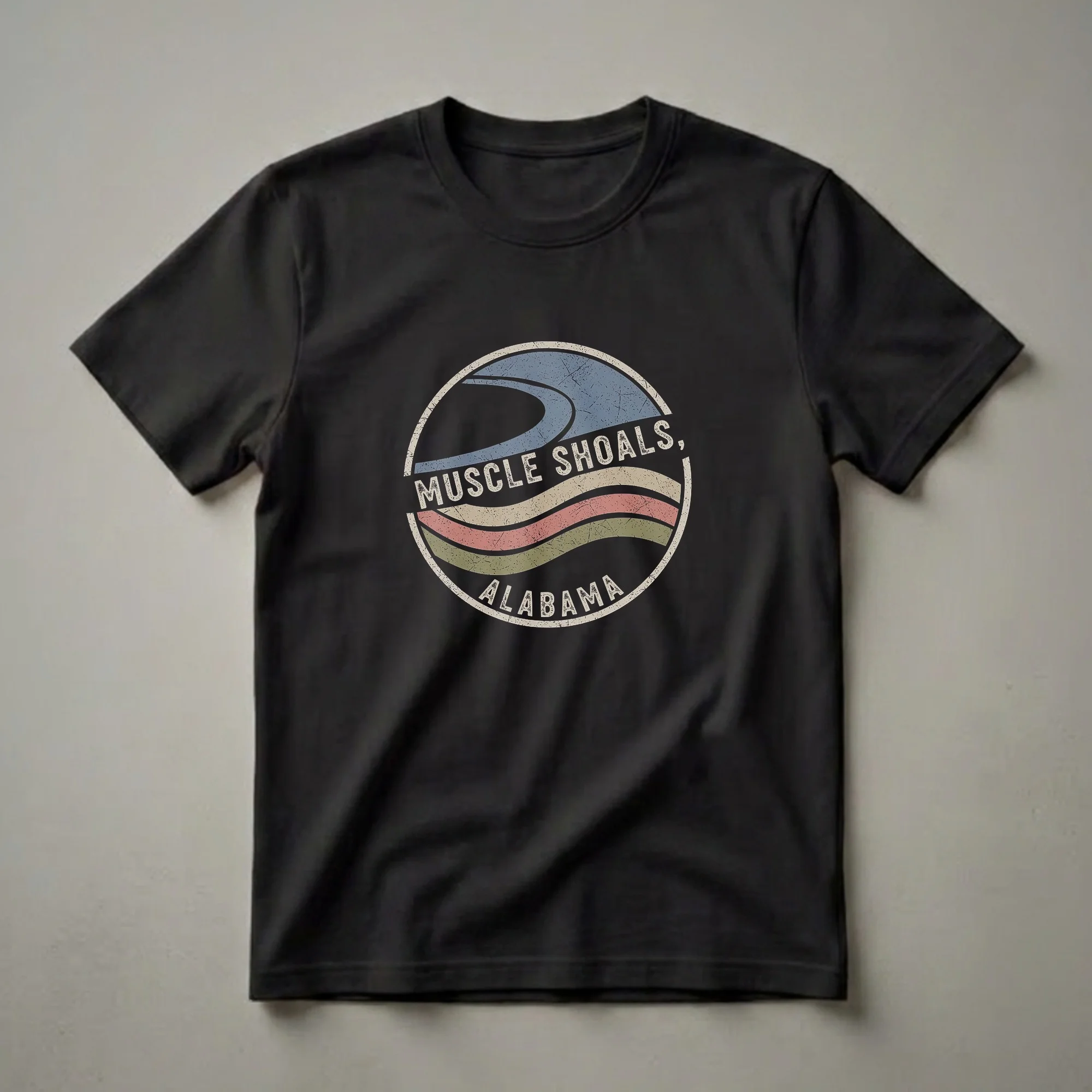 Muscle Shoals, Alabama residents and fans can now wear their pride with this distinctive retro graphic tee. The design features a circular emblem with a distressed, vintage aesthetic. Within the circle, wavy lines in muted tones of blue, beige, coral, and olive green evoke the flowing waters of the Tennessee River, which famously flows through the area and is integral to the region's identity. The text "MUSCLE SHOALS, ALABAMA" is prominently displayed in a classic, slightly worn font, anchoring the design to its specific location. Muscle Shoals is renowned for its significant contributions to music history, particularly through the legendary recording studios like FAME Studios and Muscle Shoals Sound Studio, which have hosted countless iconic artists. This shirt is a thoughtful gift for anyone who has a connection to this musically rich city, whether they are a lifelong resident, a former inhabitant, or a music aficionado who appreciates its legacy. It's a great way to represent your hometown pride or a cherished travel destination. Wear this t-shirt to local events, casual outings, or while exploring the vibrant music scene that put Muscle Shoals on the map.