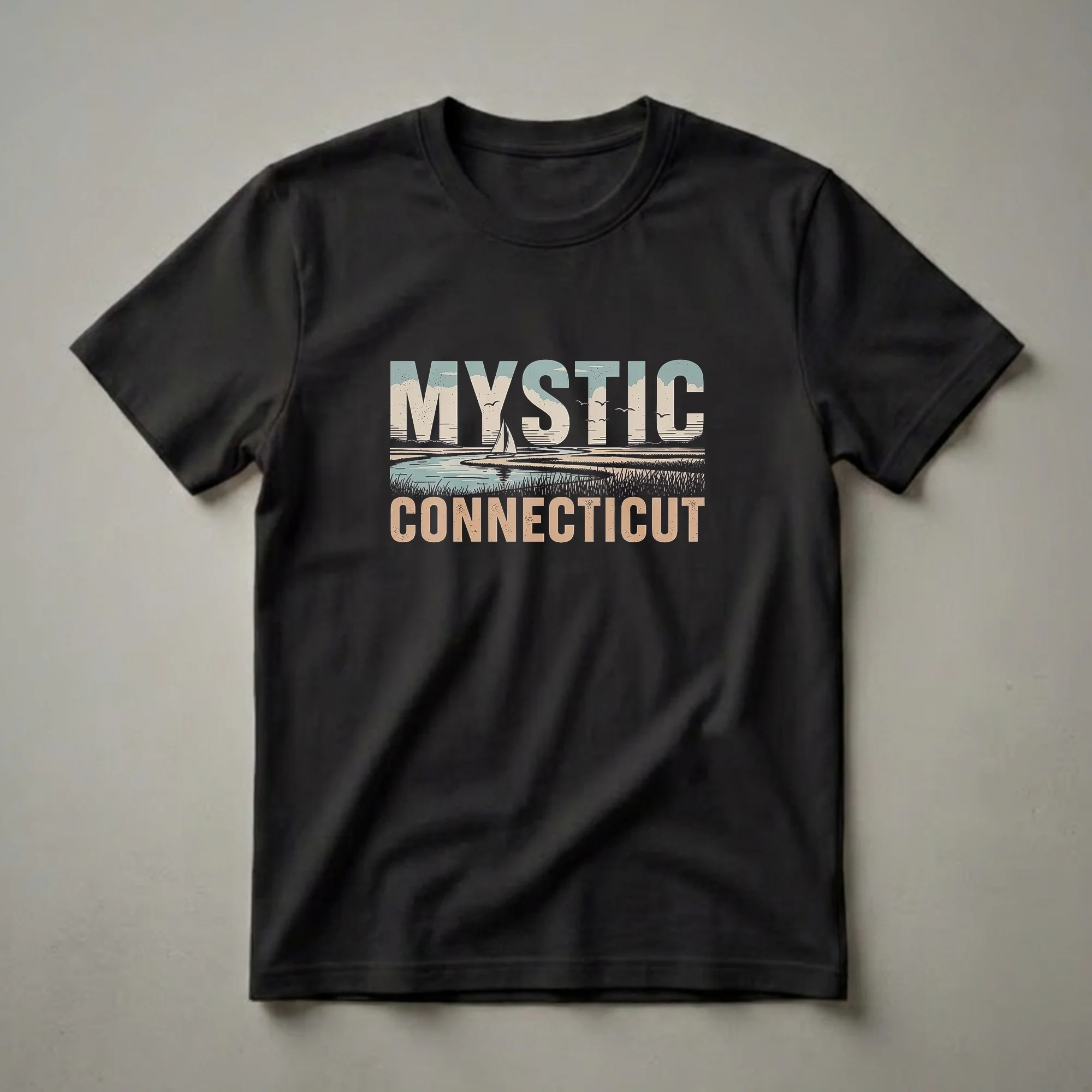 Mystic, Connecticut, a charming coastal town, is celebrated in this retro-inspired graphic tee. The design features the word "MYSTIC" prominently across the top, with a serene river scene below. A classic sailboat glides across the water, while reeds and marsh grass line the banks, evoking the coastal landscape. Above, stylized clouds drift in a pale blue sky, accompanied by a flock of seagulls in flight. The word "CONNECTICUT" is displayed below the scene in a complementary retro font. This t-shirt is a thoughtful gift for anyone who has fond memories of Mystic, whether they grew up there, visited often, or simply appreciate its maritime heritage. It's a staple for those who love New England charm and coastal vibes. Wear this shirt to a casual outing, a visit to the Mystic Seaport Museum, or simply when you want to carry a piece of Connecticut with you. This graphic shirt captures the essence of a quintessential New England summer day.