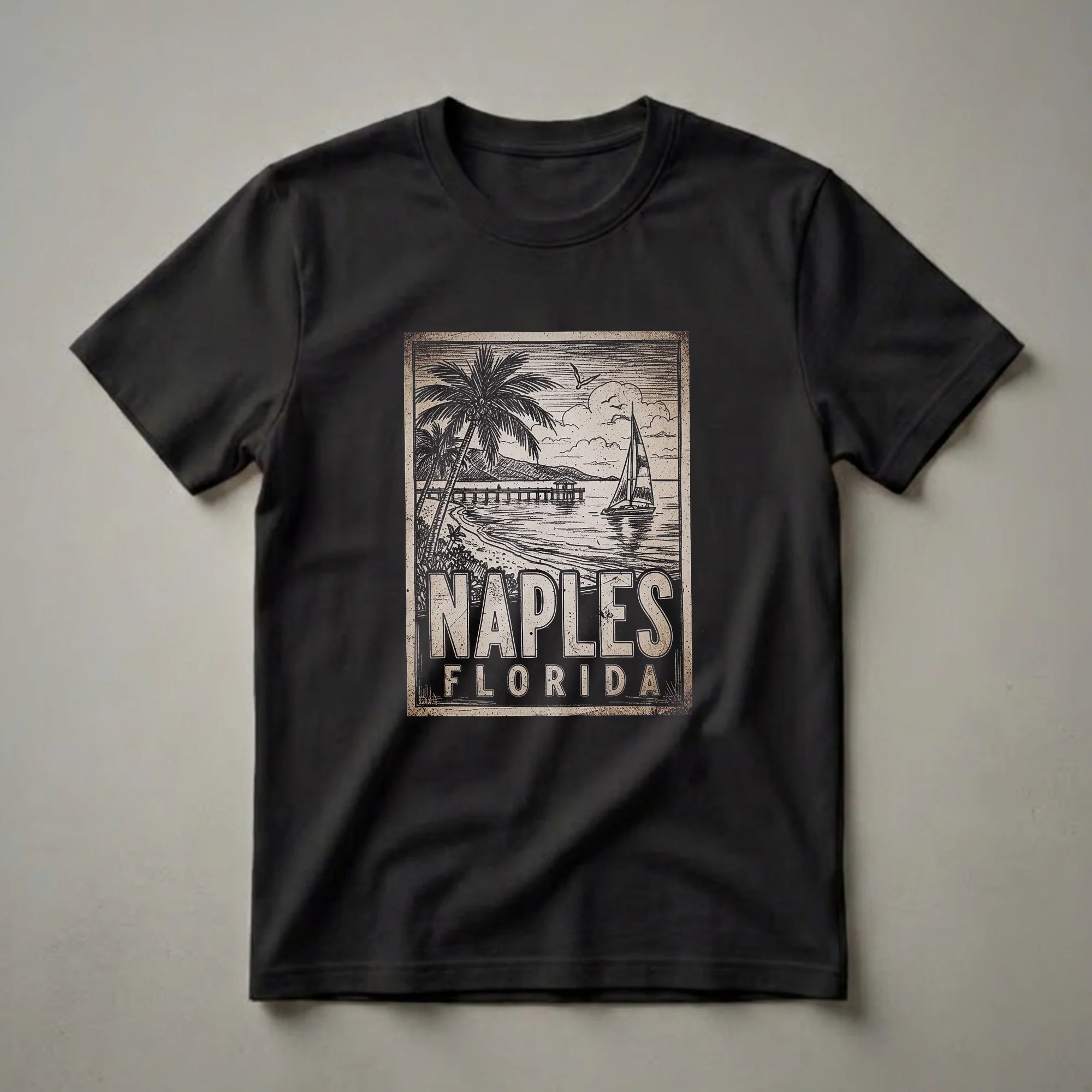 Naples, Florida, known for its pristine white-sand beaches and upscale atmosphere, is beautifully captured in this retro-inspired graphic tee. The artwork showcases a classic beach scene, complete with swaying palm trees on the left, a long pier extending into the calm ocean waters, and a sailboat gliding across the horizon under a sky dotted with clouds and seagulls. The words 'NAPLES FLORIDA' are emblazoned in a bold, vintage font, making this shirt a striking piece of apparel for anyone who loves the Gulf Coast. This t-shirt works well for residents of Naples, snowbirds who flock to the area during the winter months, or anyone who has fond memories of visiting this picturesque Southwest Florida city. It's a thoughtful gift for someone planning a trip to the Sunshine State or as a souvenir to remember a vacation. Wear this shirt to casual outings, beach days, or while exploring the charming streets of Naples.