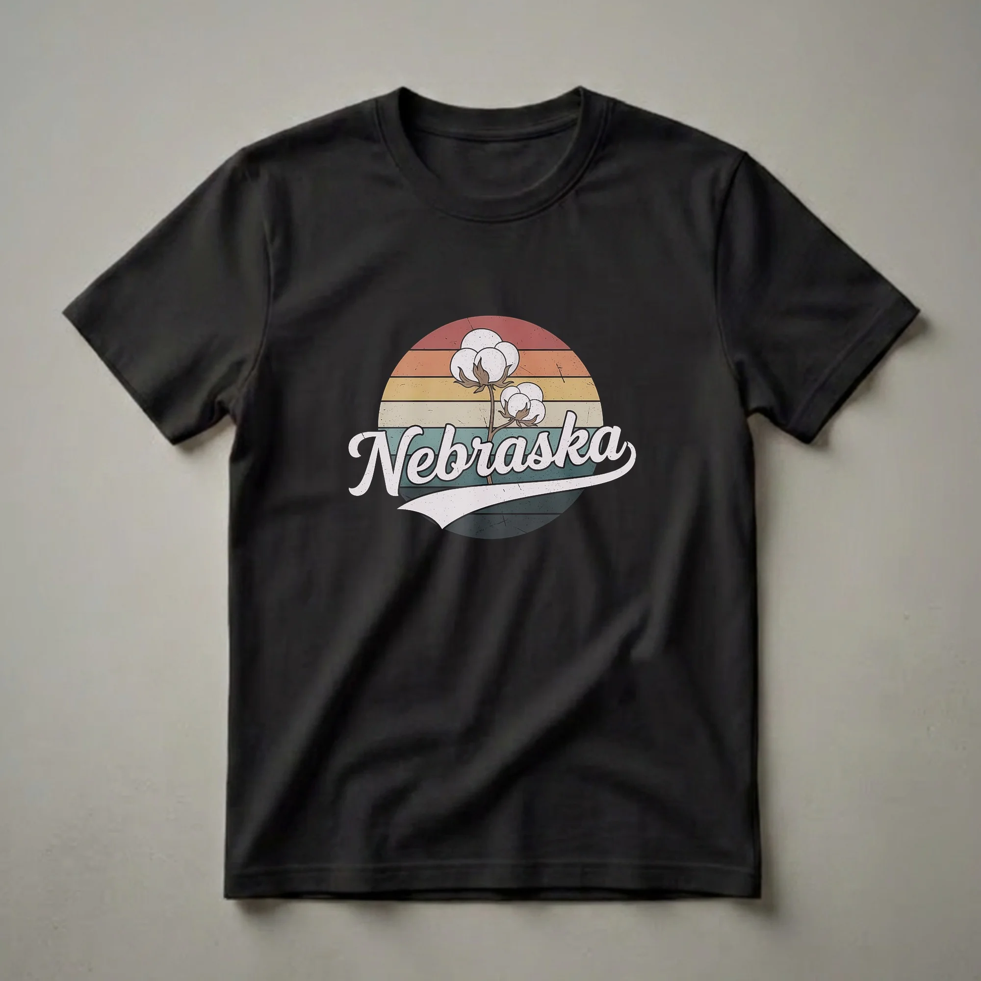 Nebraskans who appreciate a touch of vintage flair will reach for this unique graphic tee. The design showcases a stylized cotton plant with fluffy bolls, set against a retro sunset with horizontal stripes in warm, muted tones of red, orange, yellow, cream, and teal. The word "Nebraska" is emblazoned across the front in a classic, flowing script font, evoking a sense of nostalgia. Cotton is a significant crop in Nebraska, contributing to the state's agricultural identity. This shirt is a thoughtful gift for anyone with a connection to the Cornhusker State, whether they are a lifelong resident, a former student, or simply someone who admires its heritage. It's a comfortable and eye-catching piece of apparel that works well for casual outings, family gatherings, or simply relaxing at home. Wear it to celebrate your state pride or as a conversation starter about Nebraska's agricultural roots. This t-shirt offers a distinctive way to represent your home state.