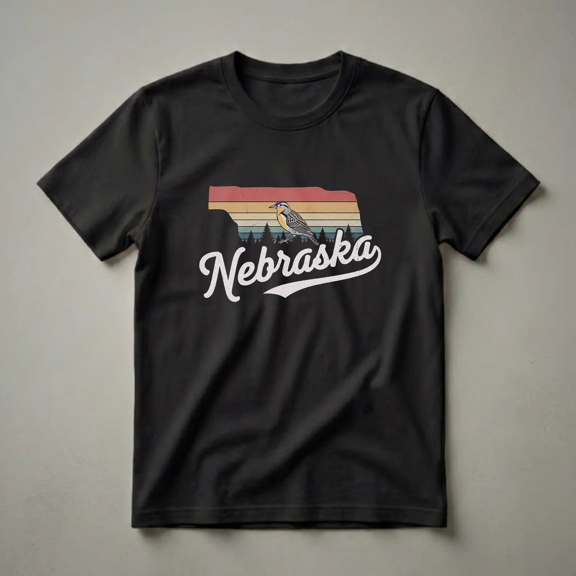Nebraska residents and bird enthusiasts will appreciate this retro-inspired graphic tee. The design prominently features the outline of the state of Nebraska, filled with vintage sunset stripes in shades of red, orange, yellow, and teal. Perched atop these stripes, within the state's silhouette, is a detailed illustration of a western meadowlark, the official state bird of Nebraska. Below the bird and stripes, the word "Nebraska" is written in a classic, bold, retro font. Silhouetted pine trees add depth to the landscape, evoking the natural beauty found across the state's diverse terrain, from the Sandhills to the Pine Ridge. This comfortable t-shirt is a thoughtful gift for anyone who calls Nebraska home, celebrates its natural heritage, or enjoys birdwatching. It's a great way to wear your state pride and your appreciation for wildlife. This tee works well for casual outings, trips to national parks, or simply relaxing at home while reminiscing about the Cornhusker State.