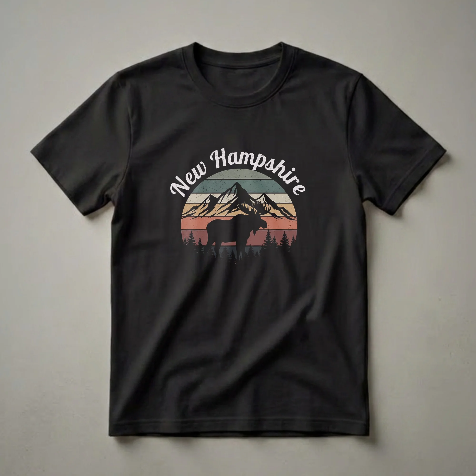- Retro New Hampshire moose and mountain sunset graphic tee for nature lovers.