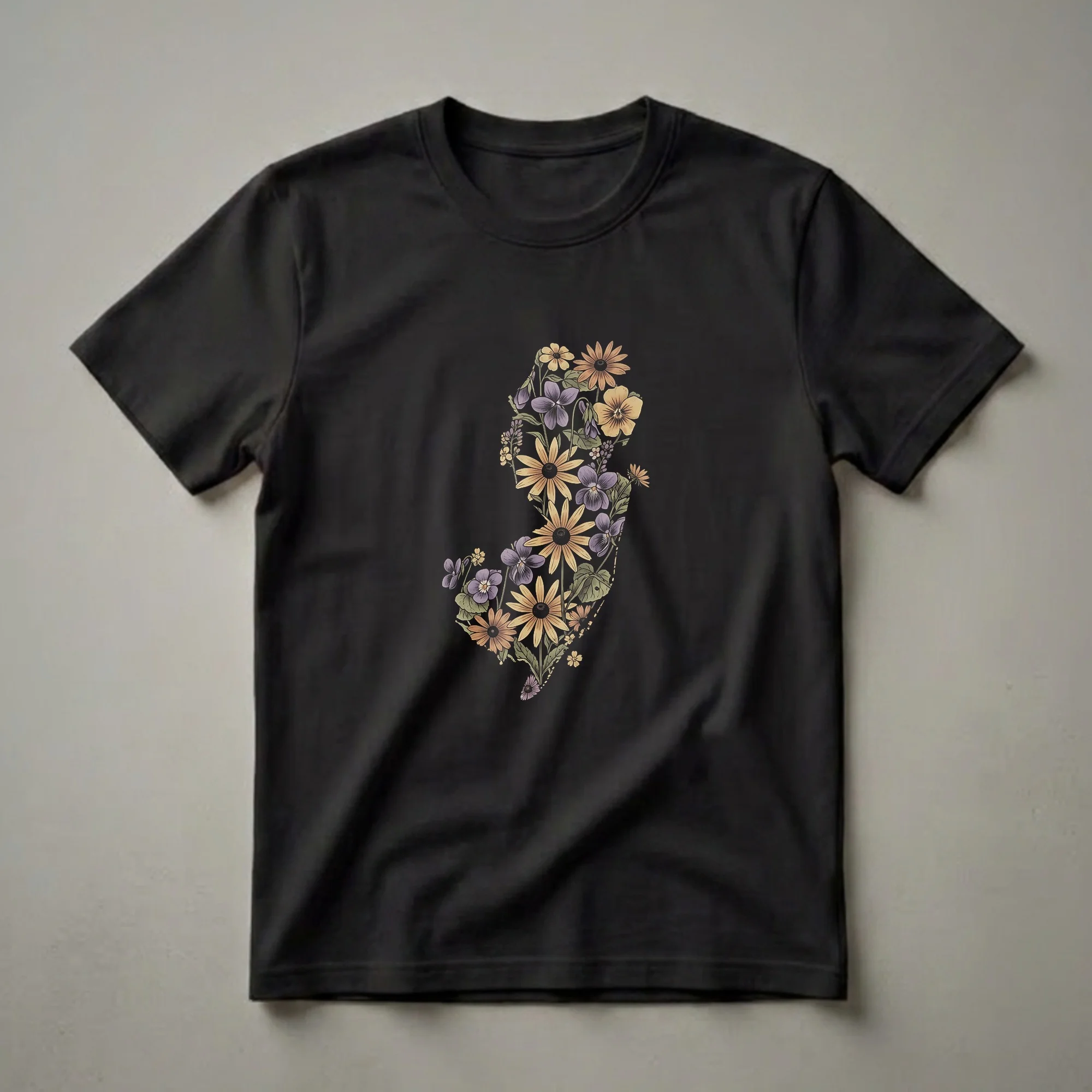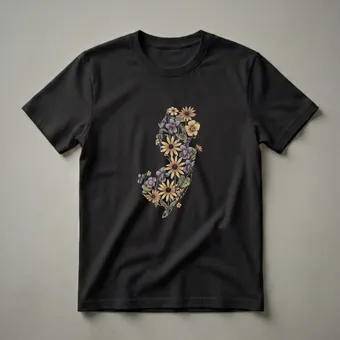 New Jersey residents and admirers of the Garden State can now wear their pride with this unique graphic tee. The design features a retro-inspired map of New Jersey, intricately filled with a vibrant arrangement of flowers. You'll see a variety of blooms, including purple violets, yellow and orange coneflowers, and delicate smaller blossoms, all rendered in a vintage art style with subtle shading and outlines. This eye-catching t-shirt is a wonderful way for anyone who calls New Jersey home, or who has fond memories of the state, to express their connection. It's a thoughtful gift for travelers who have explored the Jersey Shore or the Pine Barrens, or for gardeners who appreciate the state's natural beauty. This shirt works well for casual outings, garden visits, or simply as a comfortable everyday tee. The unique floral map design makes it a standout piece for anyone looking to celebrate their New Jersey roots or a memorable trip.