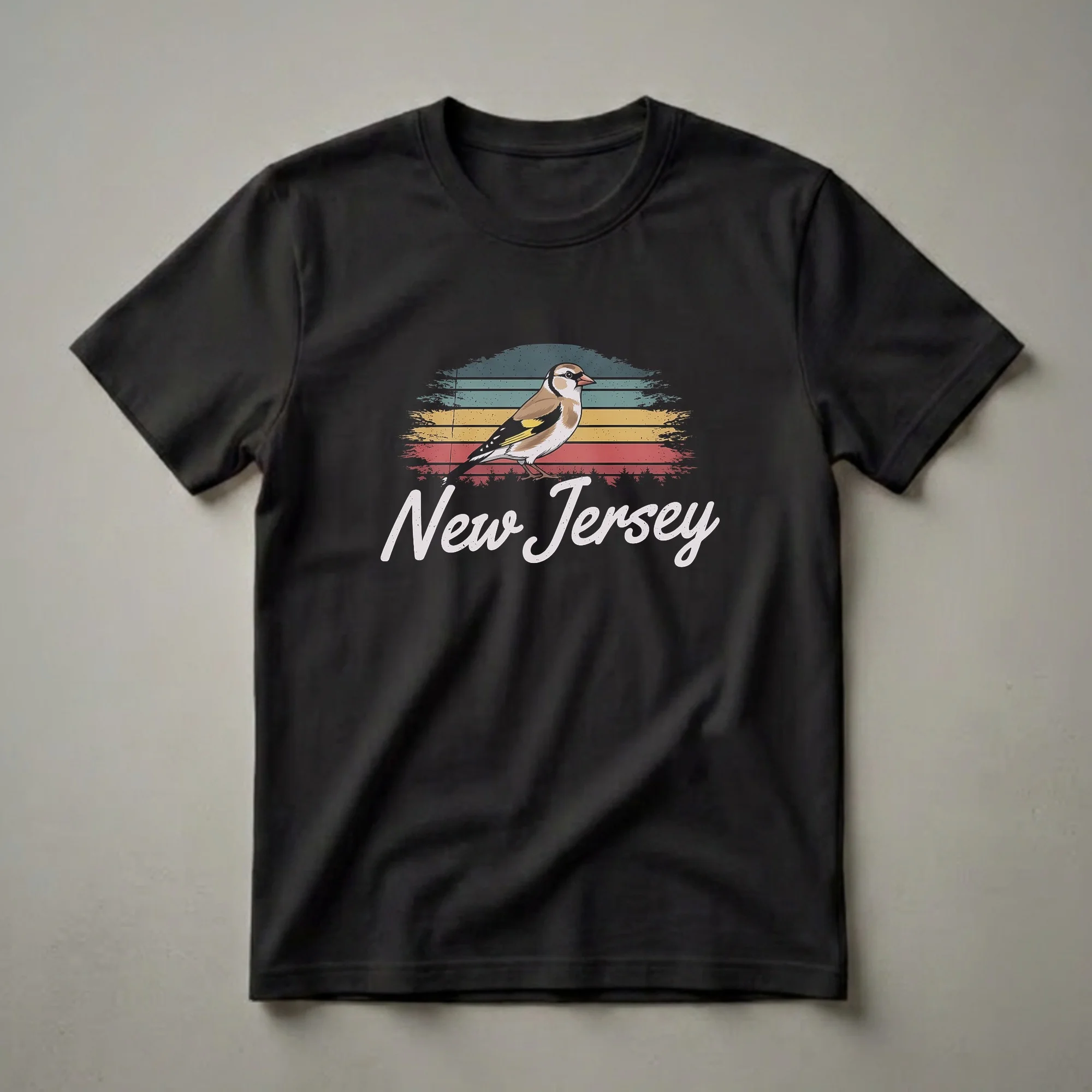 New Jersey residents and admirers of its natural beauty will appreciate this striking graphic tee. The design showcases a detailed illustration of an American Goldfinch, the state bird of New Jersey, perched against a vibrant, retro-inspired sunset with horizontal stripes in teal, yellow, and red. Below the bird, the words "New Jersey" are written in a stylish, distressed white font. The American Goldfinch, known for its cheerful song and bright yellow plumage during breeding season, is a common sight in New Jersey's diverse habitats, from open fields to woodland edges. This shirt is a fantastic way for bird watchers, nature enthusiasts, or anyone with a connection to the Garden State to express their pride. It makes a thoughtful gift for friends or family who have a fondness for ornithology or a special place in their heart for New Jersey. Wear this unique t-shirt to casual outings, birdwatching trips, or while exploring the scenic landscapes of the state.