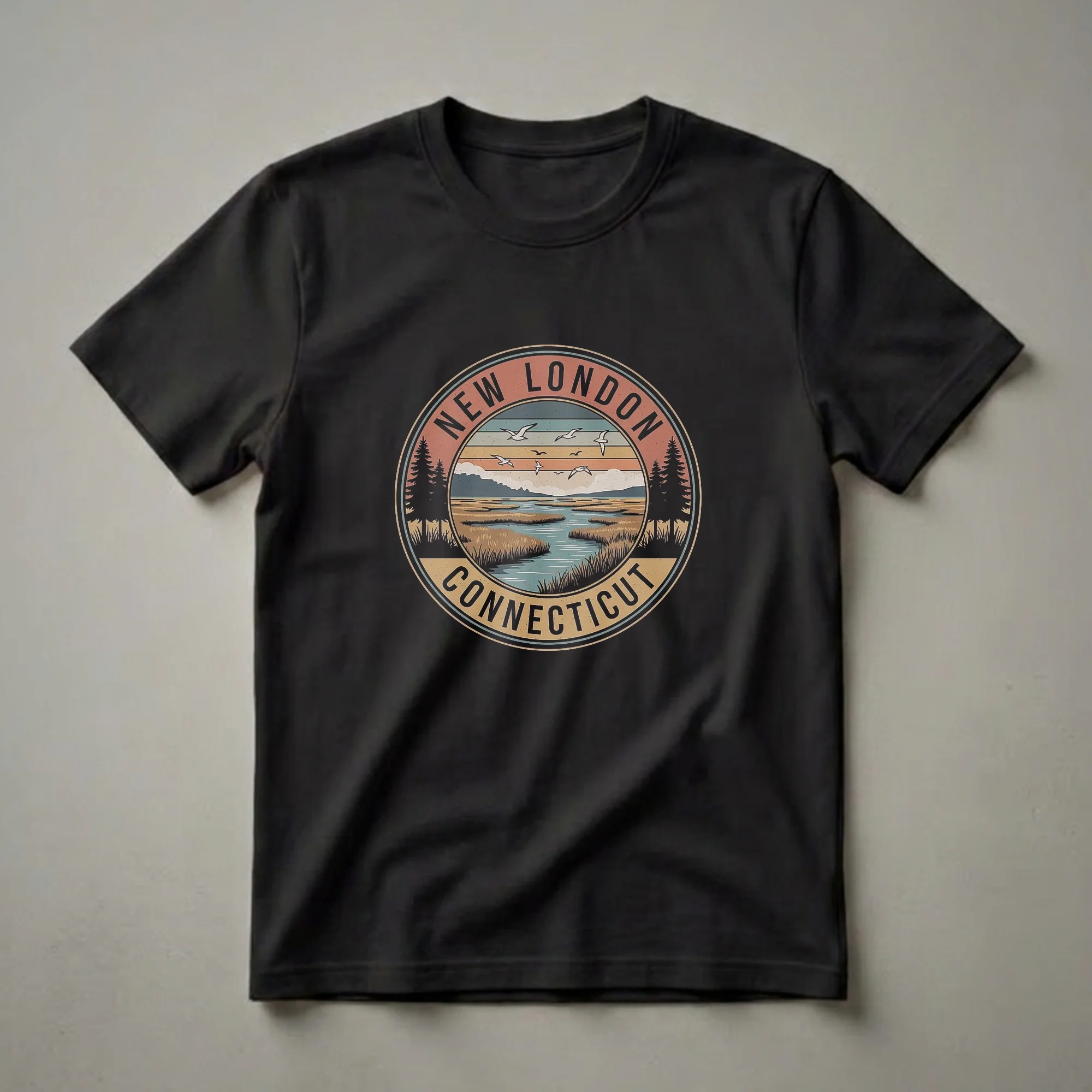 New London, Connecticut, a city rich in maritime history and coastal charm, is beautifully represented in this retro-inspired graphic tee. The design captures a serene marsh landscape at sunset, complete with silhouetted pine trees on either side and a winding waterway reflecting the warm hues of the sky. Several seagulls are depicted in flight, adding a dynamic element to the tranquil scene. The circular emblem features the text "NEW LONDON" across the top and "CONNECTICUT" along the bottom, evoking a vintage travel sticker or badge. This shirt is a perfect way for residents and visitors to express their connection to this New England coastal gem. It makes a thoughtful gift for anyone who has fond memories of the Connecticut shoreline or enjoys the natural beauty of its estuaries and birdlife. Wear this tee to casual outings, exploring local parks, or while reminiscing about time spent by the water. It's a staple for anyone who appreciates the unique character of New London.
