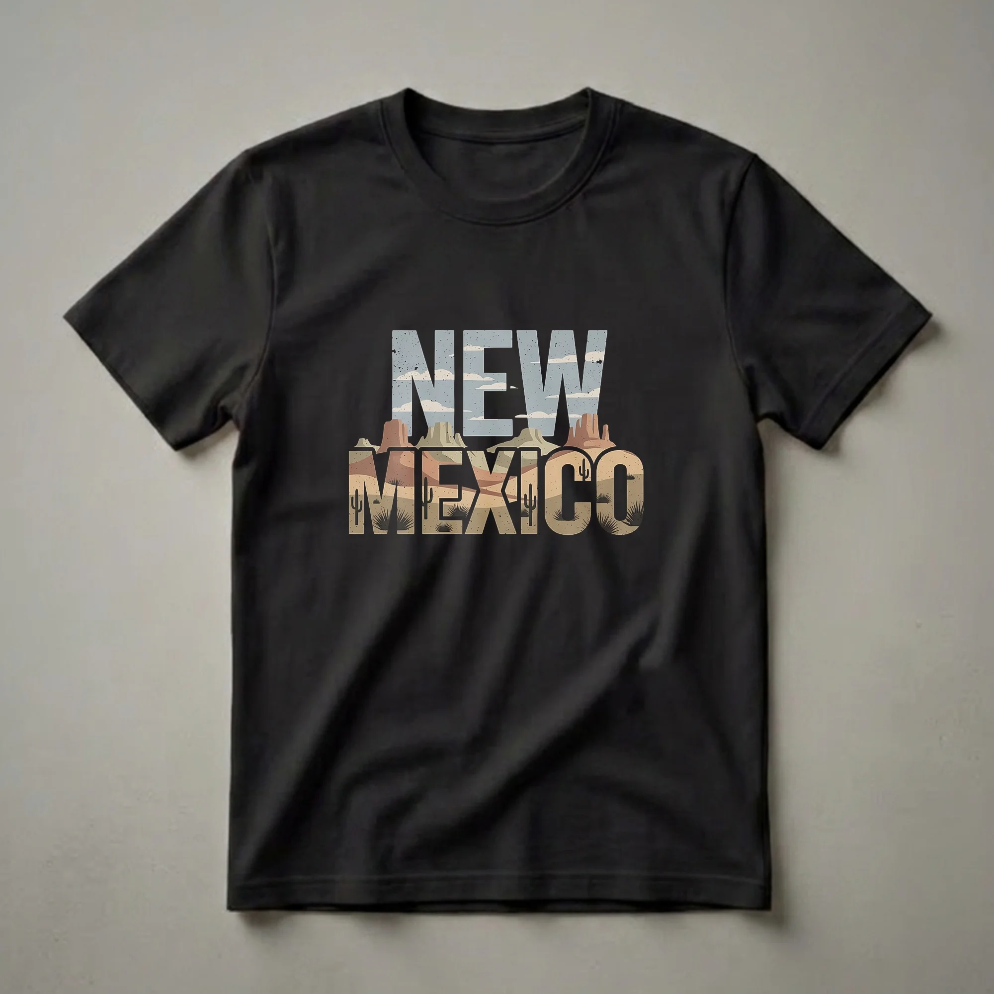 New Mexico's unique desert beauty is captured in this striking graphic tee, showcasing iconic mesas and arid landscapes. The design features the state name filled with a stylized desert scene, complete with saguaro cacti and sparse desert brush against a backdrop of layered earth tones and a cloudy sky. This visual evokes the spirit of the Land of Enchantment, known for its vast, open spaces and distinctive geological formations. New Mexico is home to the Chihuahuan Desert, one of North America's largest deserts, characterized by its unique flora and fauna, including the resilient cacti and yucca plants depicted. This shirt is a thoughtful gift for anyone who cherishes New Mexico, whether they are a resident, a frequent visitor, or simply admire its rugged charm. It's a go-to tee for casual outings, road trips through the Southwest, or simply expressing your connection to this captivating state. Wear it to celebrate New Mexico's rich cultural heritage and breathtaking natural scenery.