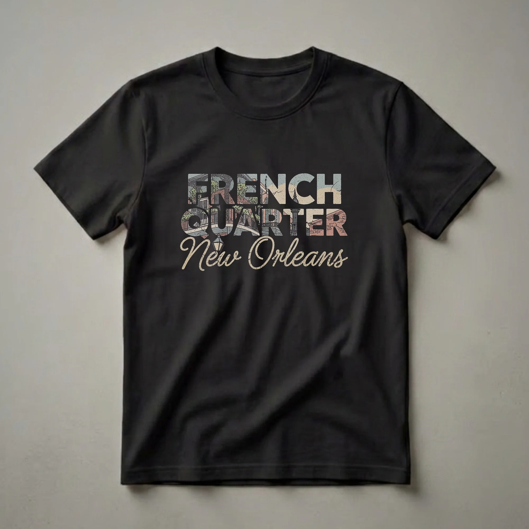 New Orleans residents and visitors who appreciate the unique architecture of the French Quarter will reach for this graphic tee. The design features the words "FRENCH QUARTER" in a distressed, block-style font, with each letter filled with a vintage illustration of iconic balconies, wrought-iron railings, and brick buildings. Below this, the phrase "New Orleans" is written in a flowing, script-like font, also with a distressed texture. This shirt is a thoughtful gift for anyone who has fond memories of strolling through the historic streets, listening to jazz music, and experiencing the vibrant culture of the city. The French Quarter, established in 1718, is one of the oldest neighborhoods in the United States and is known for its distinctive Creole and French influences. This t-shirt works well for casual outings, exploring new cities, or simply relaxing at home while reminiscing about a trip to the Big Easy. It's a staple for any wardrobe celebrating travel and unique cityscapes.