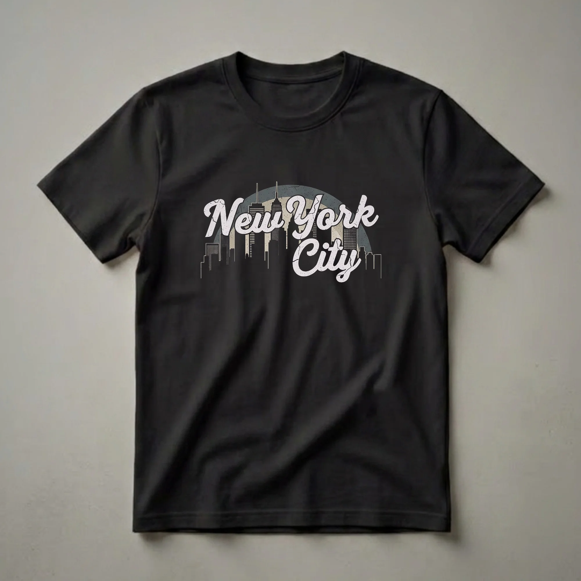 New York City, a global epicenter of culture, finance, and fashion, is celebrated in this retro-inspired graphic tee. The design features a stylized silhouette of the iconic Manhattan skyline, complete with towering skyscrapers and architectural details, set against a distressed, muted background that evokes a vintage aesthetic. The words "New York City" are emblazoned across the design in a bold, script-like font with a cracked, weathered texture, further enhancing its retro appeal. This shirt is a thoughtful gift for anyone who cherishes the energy and spirit of NYC, whether they are a lifelong resident, a frequent visitor, or simply an admirer of its unique urban landscape. It's a staple in the collection for those who appreciate classic city vibes and want to wear their New York pride. This tee works well for casual outings, exploring city streets, or reminiscing about memorable trips to the Big Apple. Wear it to a local diner, a walk through Central Park, or while catching a show in Times Square.