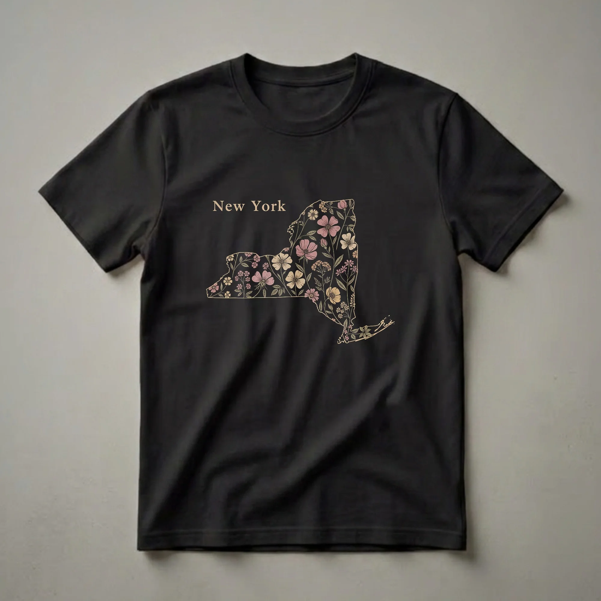 Showcase your love for the Empire State with this artfully crafted t-shirt featuring a unique floral map of New York.The design features the iconic outline of New York, intricately filled with a charming floral pattern. Delicate flowers in muted tones of pink, yellow, and green bloom across the map, creating a vintage and artistic aesthetic. This t-shirt is a beautiful representation of the state's natural beauty and its enduring appeal. New York, known for its diverse landscapes ranging from the Adirondack Mountains to the beaches of Long Island, offers a rich tapestry of natural wonders that this design subtly evokes. This shirt is a go-to tee for anyone who cherishes their connection to New York, whether they are lifelong residents, former inhabitants, or simply admirers of its unique spirit. It makes a thoughtful gift for friends or family who have a special place in their heart for the Empire State. Wear this unique New York shirt to casual outings, local events, or simply as a daily reminder of your favorite state.