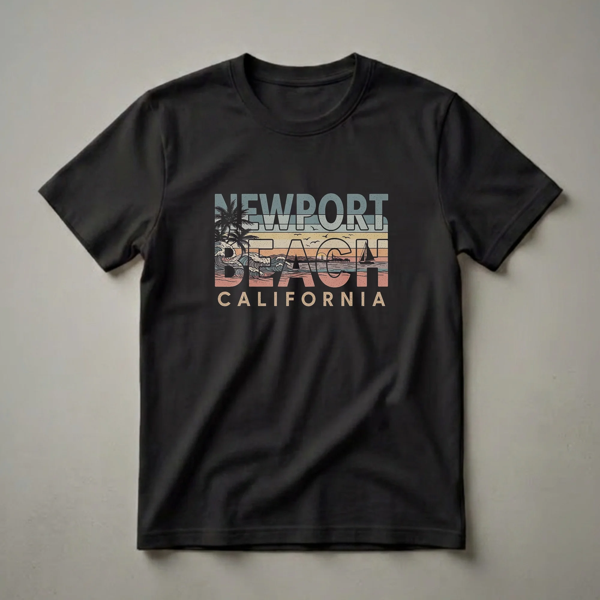 Newport Beach, California, is a coastal gem known for its stunning shoreline and vibrant surf culture. This retro-inspired graphic tee showcases that iconic spirit with a design that evokes sunny days and ocean breezes. The artwork features bold lettering spelling out 'NEWPORT BEACH CALIFORNIA,' set against a stylized sunset beach scene. Palm trees sway gently on the left, while dynamic waves crash on the shore, hinting at the world-class surfing the area is famous for. In the distance, a sailboat glides across the water, and a classic pier stretches towards the horizon, iconic landmarks of the Southern California coast. The muted, vintage color palette of blues, yellows, and corals adds to the nostalgic feel, making this shirt a go-to for anyone who cherishes memories of the California coast or dreams of visiting. This t-shirt works well for beachgoers, surfers, or anyone who loves the laid-back lifestyle of Orange County. It makes a thoughtful gift for friends and family who have a special connection to Newport Beach or California in general. Wear it to the beach, on vacation, or simply when you want to carry a piece of the California coast with you.
