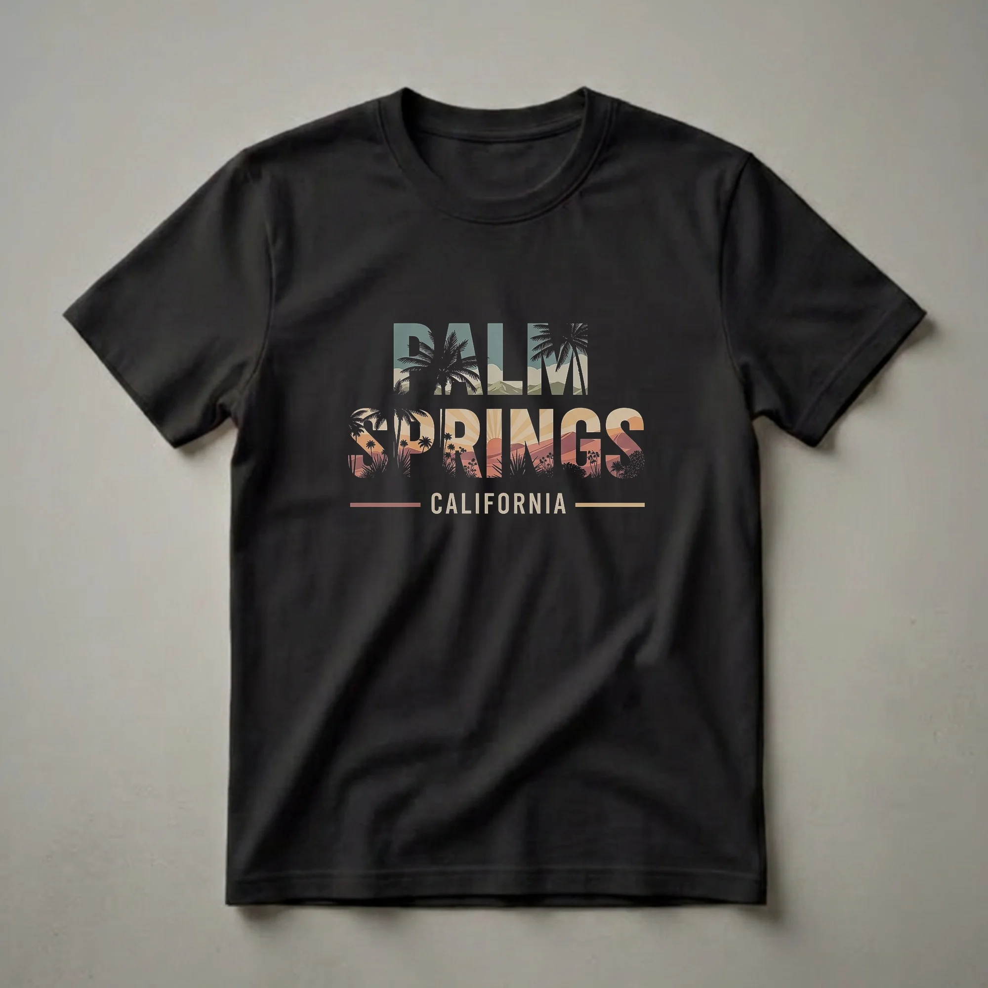 Palm Springs, California, is renowned for its mid-century modern architecture and its stunning desert landscapes, especially during sunset. This graphic tee captures that iconic aesthetic with a retro design that evokes the golden age of desert travel. The words 'Palm Springs' are artfully filled with a scene depicting silhouetted palm trees, lush desert flora, and distant mountains bathed in the warm hues of a setting sun. Below, 'CALIFORNIA' grounds the design, reinforcing its origin. This shirt is a perfect way for anyone who loves the unique charm of the Coachella Valley to express their connection to the area. It serves as a thoughtful gift for travelers who have visited Palm Springs or for those who dream of its sunny, relaxed atmosphere. Wear this tee to a casual outing, a road trip, or simply when you want to bring a piece of California's desert magic into your everyday style. It's a staple for anyone with a fondness for vintage travel aesthetics and the distinctive beauty of the American Southwest.