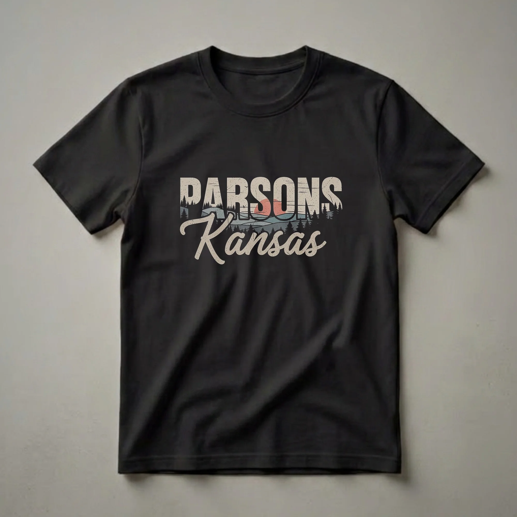 Parsons, Kansas residents and former locals can now wear their pride with this retro-inspired graphic t-shirt. The design features the city name "PARSONS" in bold, distressed block letters above "Kansas" in a flowing script. Behind the text, a stylized vintage landscape unfolds, complete with rolling hills, silhouetted pine trees, and a warm sunset peeking through the horizon. This visual evokes a sense of nostalgia and the natural beauty found in the central plains. Parsons, located in Labette County, is known for its rich railroad history and its position as a hub in Southeast Kansas. This tee works well for anyone who calls Parsons home or has fond memories of the area. It makes a thoughtful gift for friends, family, or anyone celebrating their Kansas roots. Wear this shirt to local events, casual outings, or while reminiscing about the Sunflower State.