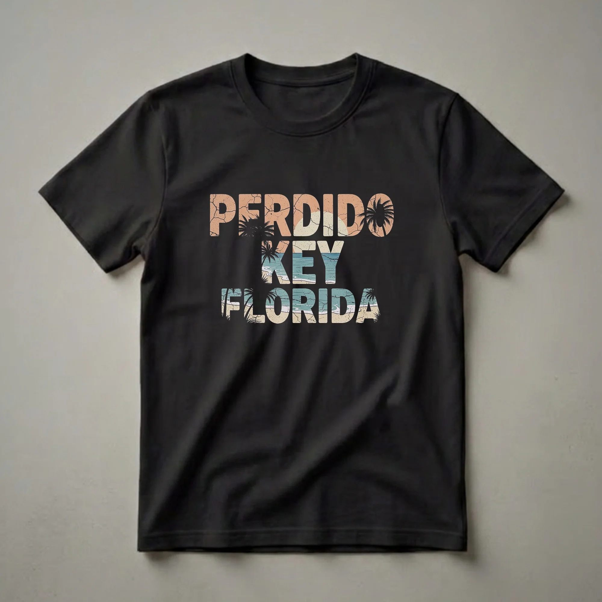 Perdido Key, Florida, a barrier island known for its pristine white sand beaches and emerald waters, is captured in this retro-inspired graphic t-shirt. The design features the words "PERDIDO KEY FLORIDA" in a distressed, vintage font. Within the letters, a stylized beach scene unfolds with palm trees silhouetted against a sunset, waves gently lapping the shore, and sandy beaches. This tee is a thoughtful gift for anyone who has vacationed on the Gulf Coast or dreams of visiting this beautiful stretch of Florida Panhandle coastline. It's a staple for your travel wardrobe, great to wear to the beach, a casual dinner, or while reminiscing about your Florida adventures. This shirt is a go-to tee for Florida residents and visitors alike who appreciate vintage travel aesthetics and coastal vibes. Wear it to remember your favorite beach getaway or to inspire your next trip to the Sunshine State.