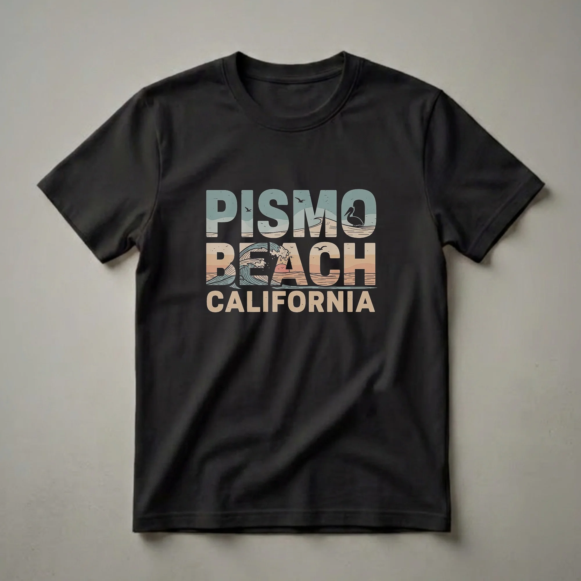 Pismo Beach, a classic California coastal town, is celebrated on this retro-inspired graphic tee. The design features bold, layered lettering spelling out "Pismo Beach California," with a dynamic wave crashing across the word "Beach." Above the wave, a silhouette of a pelican stands on the shore, with seagulls soaring in the muted, pastel sky. The sunset hues blend into the landscape, evoking a nostalgic beach vibe. This t-shirt is a go-to for anyone who cherishes the laid-back atmosphere and natural beauty of the Central Coast. Pismo Beach is known for its expansive sandy shores and is a popular destination for surfing and clam digging. This shirt makes a thoughtful gift for travelers, locals, or anyone who dreams of the California coast. Wear it to your next beach outing or casual gathering to showcase your seaside spirit.
