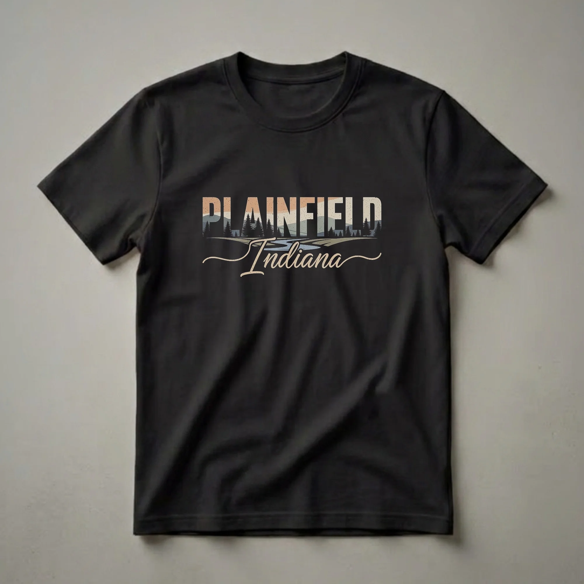 Hoosiers who appreciate the natural beauty of their home state will reach for this retro graphic tee. The design features the word "PLAINFIELD" in large, distressed block letters, filled with a muted landscape of rolling hills, pine trees, and a winding river under a speckled sky. Below, the word "Indiana" is written in a flowing, cursive script, adding a touch of vintage charm. This shirt is a thoughtful gift for anyone with a connection to Plainfield, whether they are a lifelong resident, a former student, or simply someone who cherishes the unique character of the Midwest. Plainfield, Indiana, located in Hendricks County, is known for its friendly community and scenic surroundings, making this shirt a subtle yet proud declaration of local pride. This comfortable tee is suitable for casual outings, weekend adventures, or simply relaxing at home while reminiscing about the heartland. It’s a staple in the collection for any proud resident of Indiana.