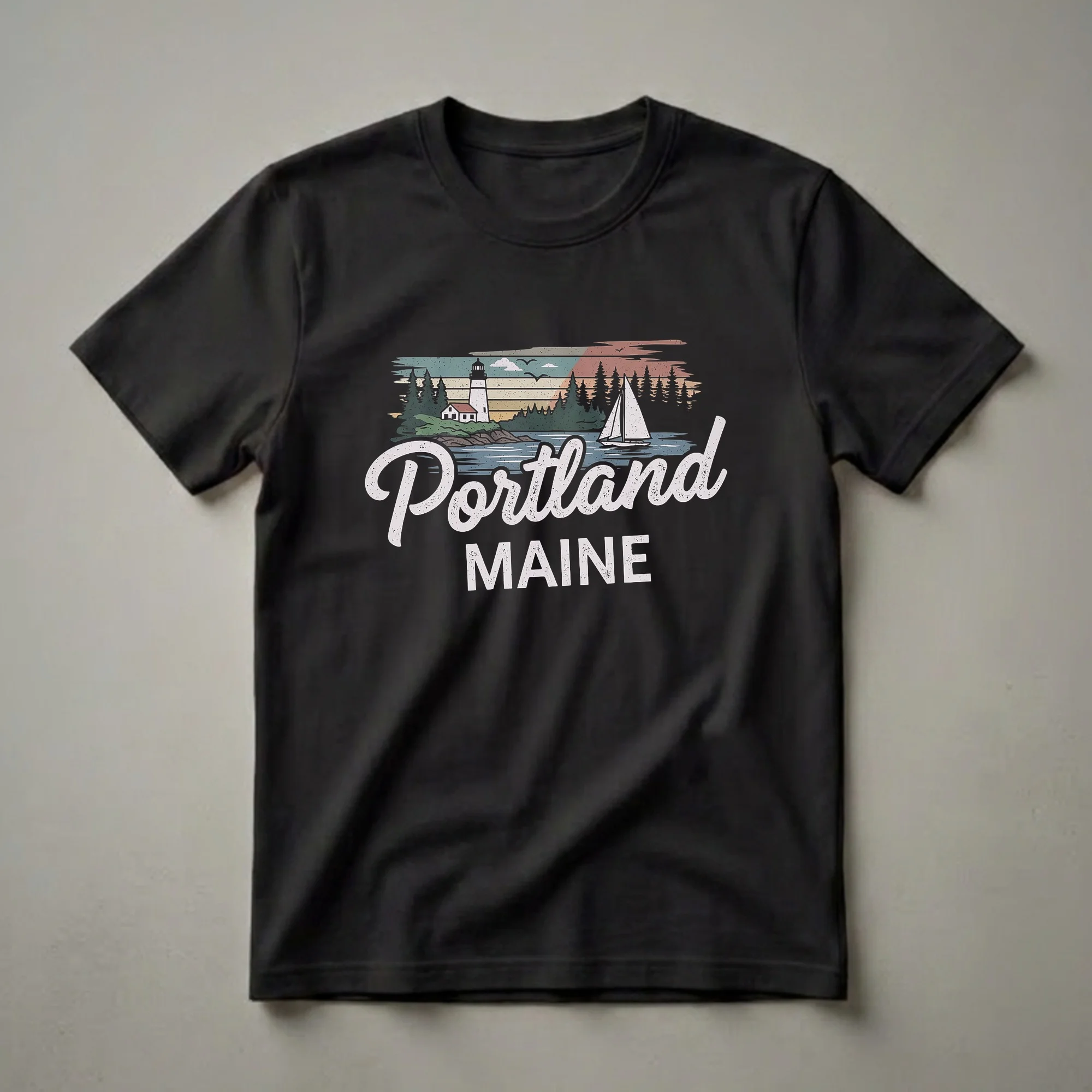 Portland, Maine residents and visitors who appreciate coastal charm will reach for this retro-inspired graphic tee. The design showcases a classic lighthouse perched on a rocky shore, overlooking the water where a sailboat glides by. Pine trees frame the scene, evoking the rugged beauty of the Maine coastline. This shirt captures the essence of Portland's maritime heritage and scenic beauty, making it a staple for anyone who cherishes memories of this vibrant city. Portland, Maine, is known for its historic lighthouses, including the iconic Portland Head Light, and its bustling harbor, which has been a center for trade and fishing for centuries. This tee is a thoughtful gift for a Maine native, a recent visitor, or anyone who dreams of the ocean breeze and picturesque New England landscapes. Wear this t-shirt to casual outings, exploring the city's historic Old Port, or simply relaxing by the water, remembering your favorite moments in this charming coastal destination.
