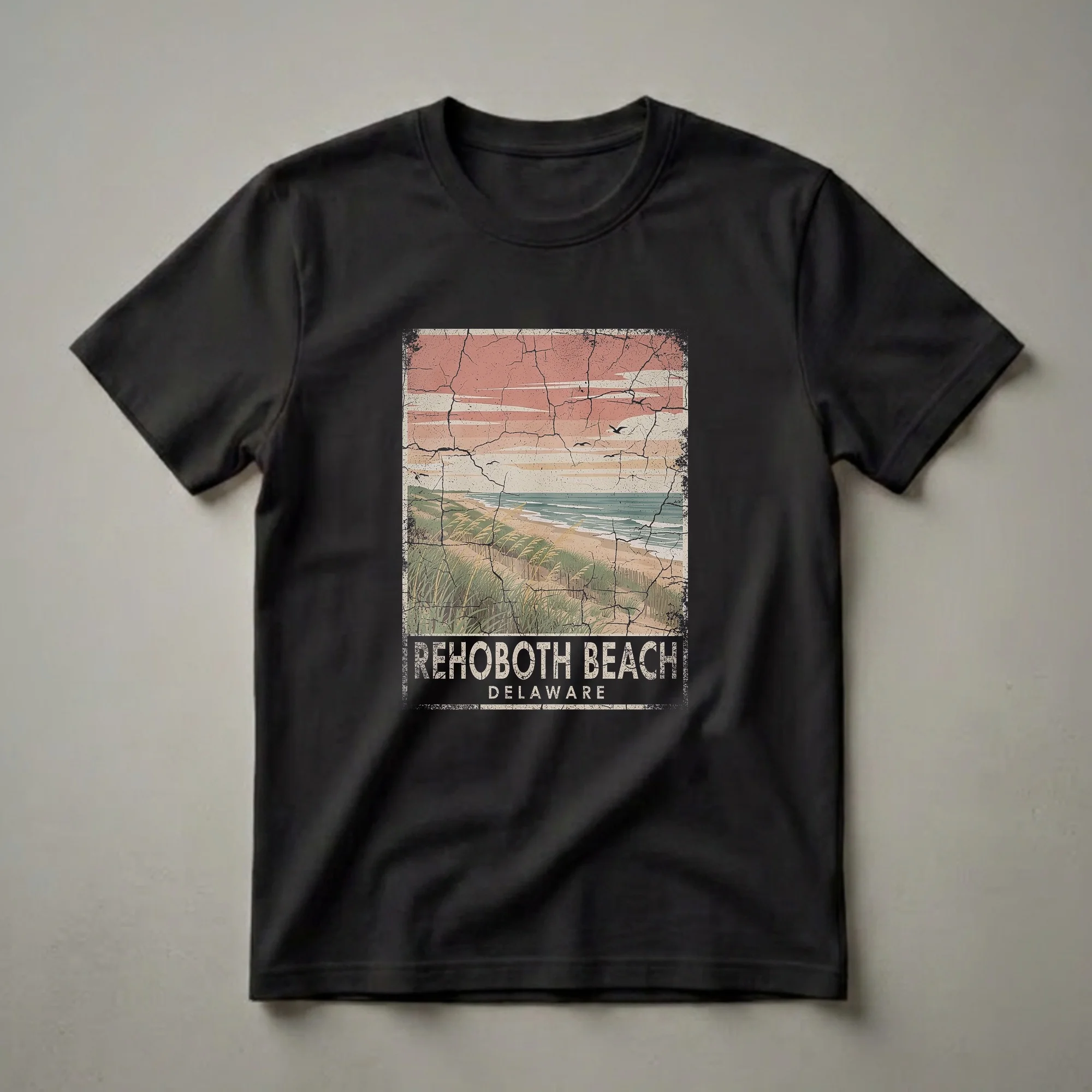 Rehoboth Beach, Delaware, a popular coastal destination, is celebrated in this retro-inspired graphic tee. The design showcases a serene beach scene with rolling dunes covered in sea grass, leading to the gentle waves of the Atlantic Ocean under a sky filled with soft clouds and silhouetted birds. The artwork features a distressed, vintage aesthetic, complete with crackled textures and a muted color palette of warm oranges, sandy beiges, and ocean blues, evoking a sense of nostalgia. Below the scenic view, the words "REHOBOTH BEACH" are prominently displayed in a bold, textured font, with "DELAWARE" centered underneath. This graphic shirt is a thoughtful gift for anyone who cherishes memories of Rehoboth Beach, whether they are locals, frequent visitors, or simply appreciate coastal art. It's a great way to wear your love for this Delaware shore town. This tee works well for casual outings, beach trips, or as a souvenir to remember a vacation. Rehoboth Beach is known for its boardwalk and family-friendly atmosphere, making this shirt a perfect memento for those who have enjoyed its attractions.