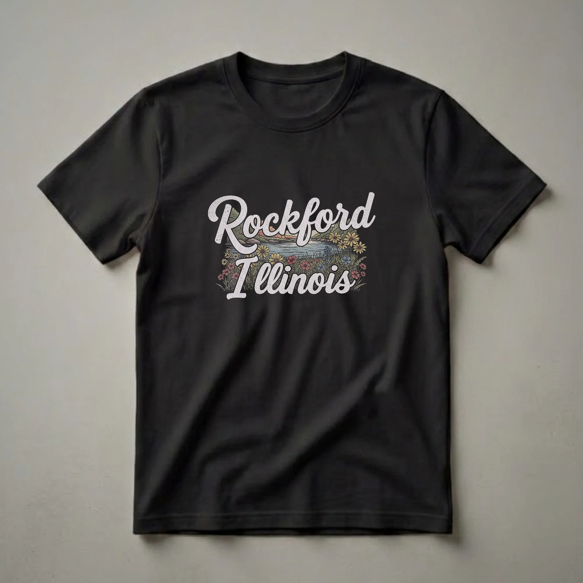 Rockford, Illinois residents and visitors can celebrate their connection to the Prairie State with this retro-inspired graphic tee. The design showcases a serene river scene, complete with rolling hills in the background and a vibrant array of wildflowers in the foreground. The text 'Rockford Illinois' is presented in a classic, distressed script font, evoking a sense of nostalgia and timeless appeal. This shirt is a thoughtful gift for anyone who cherishes memories of Rockford or enjoys the natural beauty of the region. The design captures the essence of a peaceful day by the water, making it a go-to tee for casual outings or expressing local pride. Whether you're a long-time resident or a visitor who fell in love with the area, this t-shirt serves as a wearable reminder of Rockford's charm. It's a great way to showcase your Illinois roots and appreciation for scenic landscapes. Wear this shirt to local events, family gatherings, or simply while enjoying a day out, celebrating the unique spirit of Rockford.
