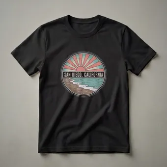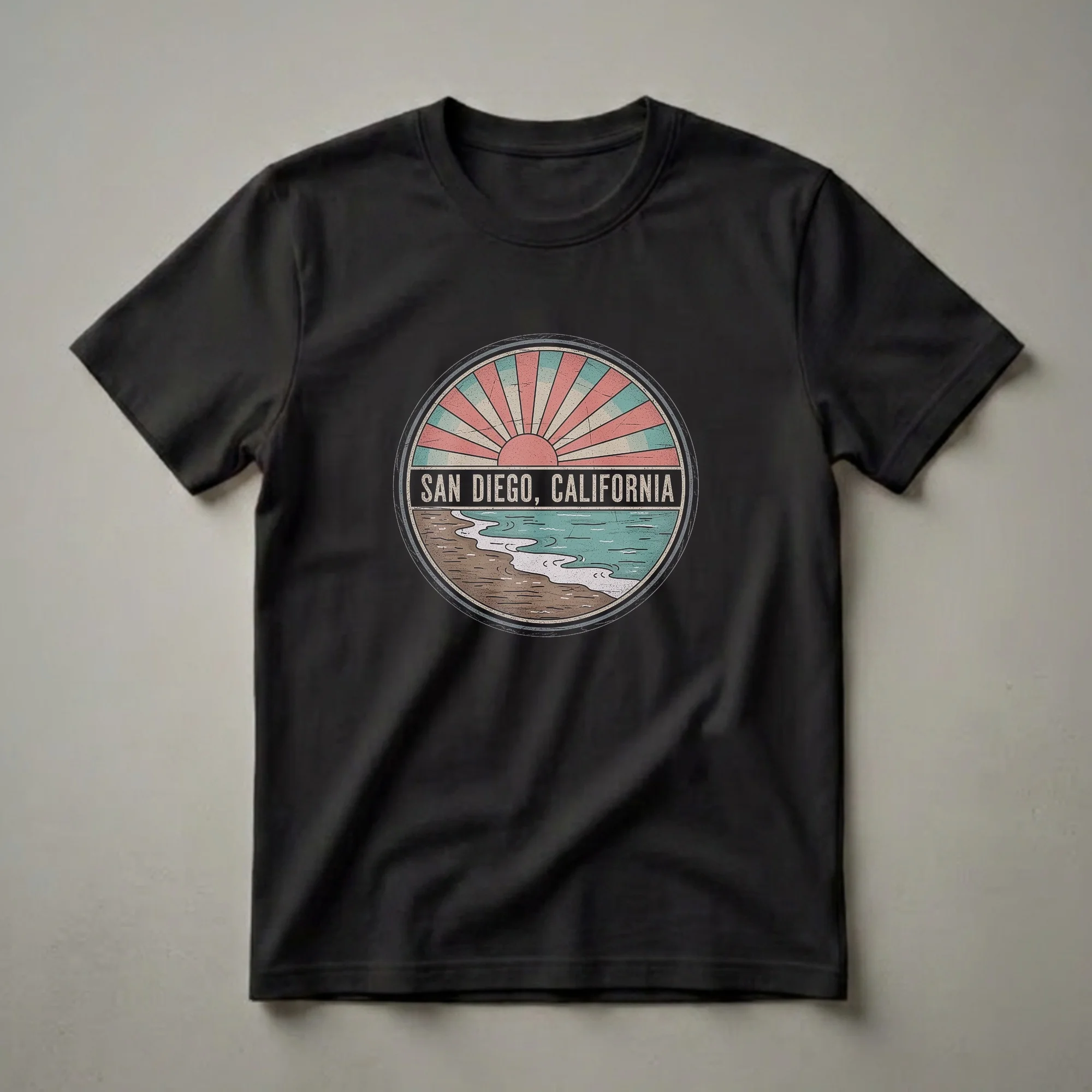 San Diego, California, a coastal gem known for its beautiful beaches and year-round sunshine, is celebrated in this retro-inspired graphic tee. The design showcases a circular emblem with a stylized sun setting over the Pacific Ocean, casting rays of warm color across the sky. Below the sun, the text "SAN DIEGO, CALIFORNIA" is prominently displayed in a vintage font, anchoring the design to this iconic Southern California city. The scene transitions to a sandy beach with gentle waves lapping at the shore, rendered in a muted, earthy palette. This t-shirt is a thoughtful gift for anyone who cherishes memories of San Diego, whether they are a lifelong resident, a frequent visitor, or simply a fan of the California coast. It's a staple in the collection for those who appreciate vintage travel aesthetics and want to wear their love for the Golden State. This tee works well for casual outings, beach days, or as a reminder of a memorable vacation. Imagine wearing this shirt while exploring the Gaslamp Quarter or enjoying a sunset cruise.
