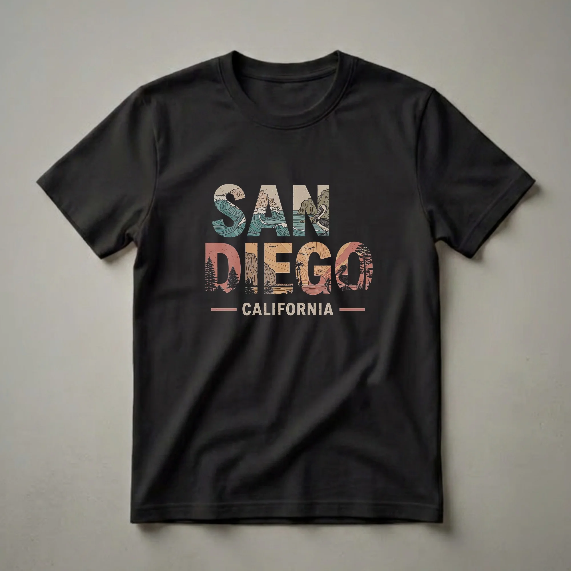 San Diego, California, is a coastal gem known for its beautiful beaches and vibrant sunsets, perfectly captured in this retro-inspired graphic tee. The design creatively integrates iconic imagery within the letters of 'SAN DIEGO CALIFORNIA.' You can see crashing waves and rugged cliffs filling the 'SAN' portion, evoking the city's dramatic coastline. The 'DIEGO' section transitions to a warm sunset scene, complete with silhouetted palm trees and pelicans perched on rocks, reflecting the city's relaxed, beach-centric lifestyle. This t-shirt is a thoughtful gift for anyone who cherishes memories of San Diego or dreams of visiting its sunny shores. It's a go-to tee for casual outings, beach days, or simply reminiscing about the Southern California experience. The inclusion of pine trees alongside coastal elements hints at the diverse landscapes found within the greater San Diego region, from the coast to the nearby mountains. This shirt works well for residents, tourists, or anyone who appreciates vintage travel aesthetics and the unique charm of this Pacific city. Wear it to remember your favorite vacation or to showcase your local pride.