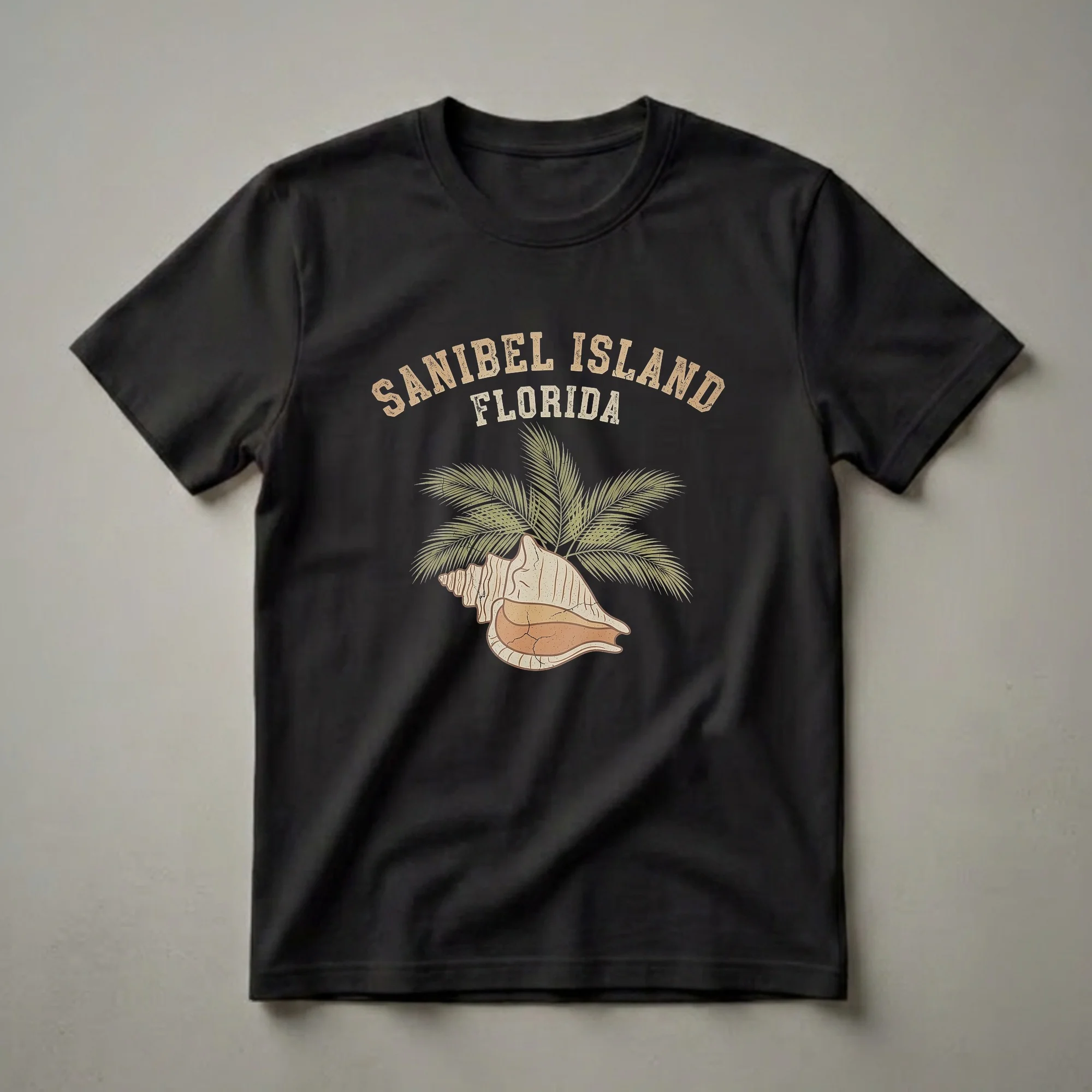 Sanibel Island, Florida, is renowned for its pristine beaches and abundant seashells, making it a prime destination for beachcombers. This graphic tee captures that coastal charm with a vintage-inspired design. Dominating the artwork is a detailed illustration of a conch shell, a common find along Florida's Gulf Coast, rendered in warm, earthy tones with subtle cracks and textures that evoke a sense of age and authenticity. Behind the shell, a cluster of lush green palm fronds fans out, symbolizing the tropical paradise that Sanibel Island represents. The text "SANIBEL ISLAND" arches above in a distressed, collegiate-style font, while "FLORIDA" sits below in a similar, slightly smaller font. This shirt is a thoughtful gift for anyone who cherishes memories of Sanibel Island or dreams of visiting its shores. It's a staple for beach vacations, casual outings, or simply relaxing at home while reminiscing about the Florida coast. Wear this tee to celebrate your connection to this unique barrier island, known for its relaxed atmosphere and natural beauty. This t-shirt is a fantastic way to carry a piece of the Sunshine State with you, whether you're a resident, a frequent visitor, or a snowbird.