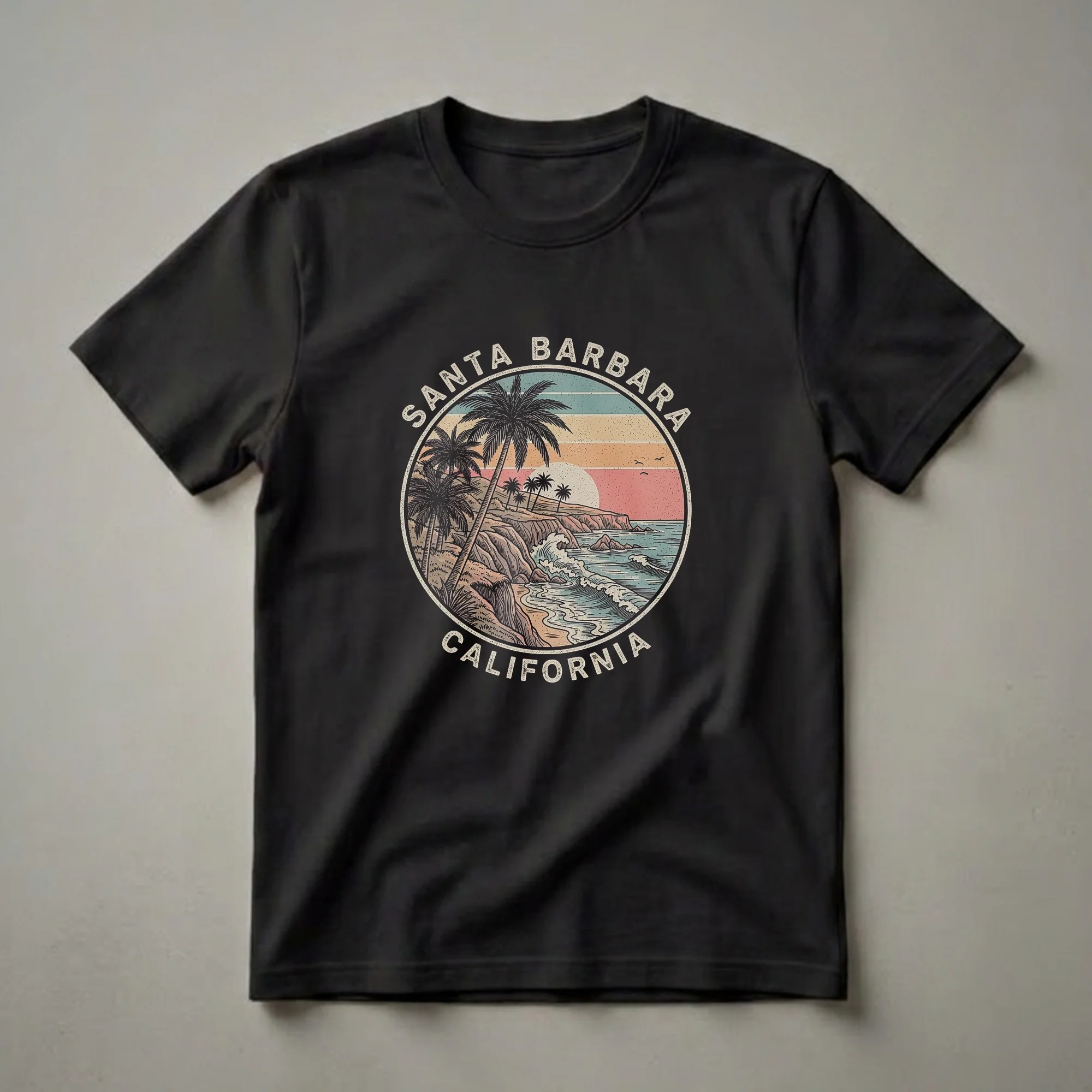 Santa Barbara, California, is renowned for its stunning coastline and Mediterranean-like climate, making it a sought-after destination for beach lovers and travelers alike. This graphic tee captures that iconic vibe with a retro-inspired circular design. The artwork showcases a picturesque scene featuring lush palm trees swaying against a backdrop of rolling hills and a vibrant sunset. Crashing waves meet the sandy shore, with rocky outcrops adding texture to the coastal landscape. The design incorporates a vintage color palette with horizontal stripes of muted blues, tans, and pinks, evoking a nostalgic feel. The words "SANTA BARBARA" and "CALIFORNIA" are emblazoned in a distressed, retro font around the circular emblem. This t-shirt is a thoughtful gift for anyone who cherishes memories of the California coast or dreams of visiting its beautiful beaches. It's a go-to tee for casual outings, beach days, or simply relaxing while reminiscing about sunny California getaways. Wear this shirt to celebrate your love for the Golden State's picturesque shores and laid-back atmosphere.