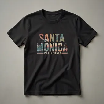 Santa Monica, California, is a vibrant coastal city renowned for its iconic pier, lively atmosphere, and beautiful beaches. This graphic tee captures the essence of this beloved Southern California destination with a striking retro design. The words 'SANTA MONICA' are emblazoned across the top, filled with imagery of crashing waves, palm trees, and a radiant sunset over the ocean. Below, 'CALIFORNIA' is presented in a clean, bold font, anchored by vintage-inspired horizontal lines. The color palette evokes a nostalgic feel, with warm oranges, muted blues, and earthy tones reminiscent of classic California surf culture. This t-shirt is a thoughtful gift for anyone who cherishes memories of Santa Monica or dreams of visiting its sun-drenched shores. It's a go-to tee for beach lovers, surfers, or anyone who appreciates vintage travel aesthetics. Wear this shirt to a casual day out, a beach bonfire, or while exploring the vibrant streets of Los Angeles. It's a staple for expressing your connection to the Golden State's iconic coastline, making it a perfect souvenir or a reminder of sunny days spent by the Pacific.