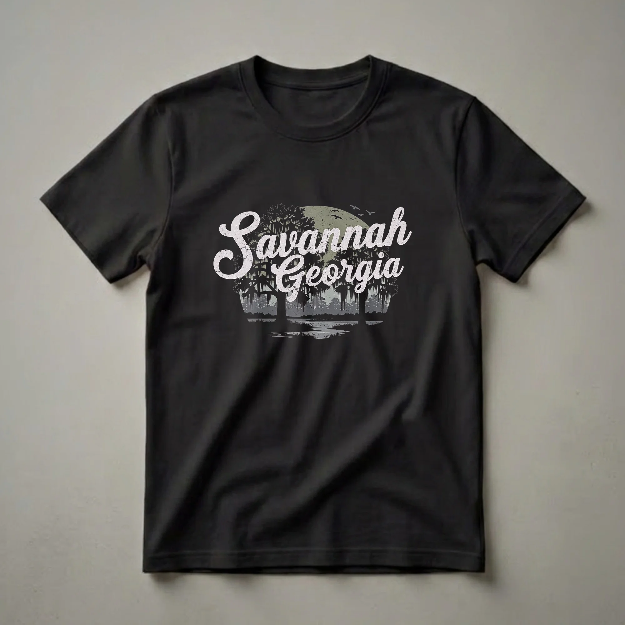 Savannah, Georgia, a city steeped in history and Southern charm, is beautifully captured in this retro graphic tee design. The artwork depicts a classic Southern landscape, complete with majestic oak trees draped in Spanish moss, a tranquil swampy river reflecting the muted moonlight, and a flock of birds soaring across the dusky sky. This visual evokes the unique atmosphere of the Georgia coast, known for its historic squares and coastal marshes. This t-shirt is a wonderful way for anyone who cherves Savannah to express their connection to the city. It makes a thoughtful gift for residents, former inhabitants, or visitors who have fallen in love with its timeless beauty. Wear this shirt to a casual outing, a trip back to the Hostess City, or simply as a reminder of your favorite Southern destination. The design captures the essence of the region, making it a staple for any wardrobe celebrating Georgia's coastal heritage. This graphic shirt is a conversation starter for those who appreciate vintage aesthetics and the allure of the Southeast.