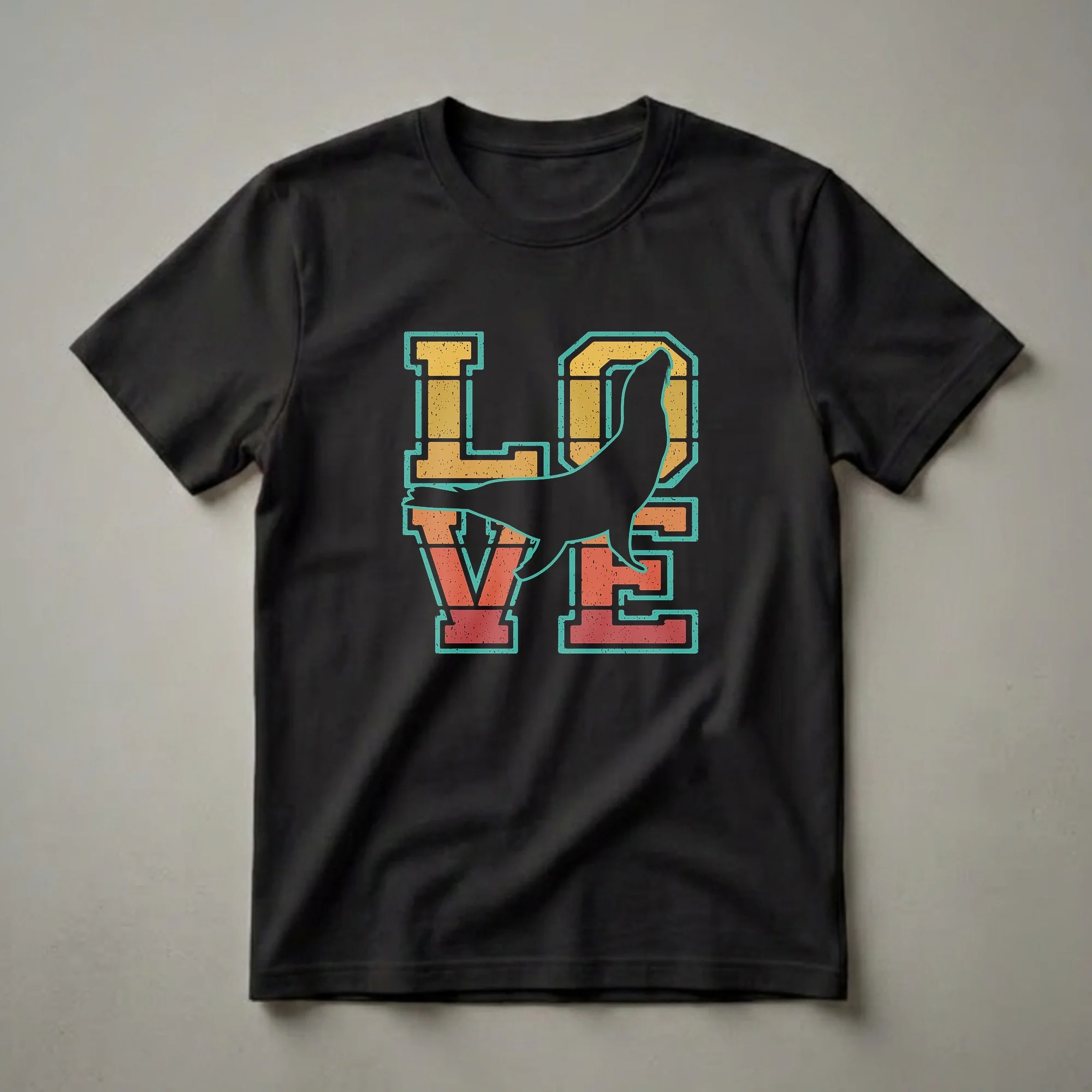 Sea animal lovers can now wear their affection for these fascinating marine mammals with this retro-inspired graphic tee. The design prominently features the word 'LOVE,' with the 'O' replaced by the striking silhouette of a seal. This seal is depicted in a dynamic pose, head tilted back as if calling out or basking. The letters themselves are rendered in a vintage style, showcasing horizontal stripes of warm colors like yellow, orange, and red, all framed by a cool teal outline. A distressed texture adds to the retro aesthetic, giving it a well-loved, classic feel. Seals, known for their playful nature and sleek bodies, are a beloved part of ocean ecosystems. They are found in various aquatic environments worldwide, from the Arctic to temperate waters, often seen basking on shorelines or diving for food. This t-shirt is a thoughtful gift for anyone who adores seals, whether they are marine biologists, divers, or simply appreciate the beauty of ocean life. It's a great way for a seal mom or seal dad to express their passion. This shirt works well for casual outings, beach trips, or as a conversation starter at marine life events. It's a staple in the collection for those who cherish the sea and its inhabitants.