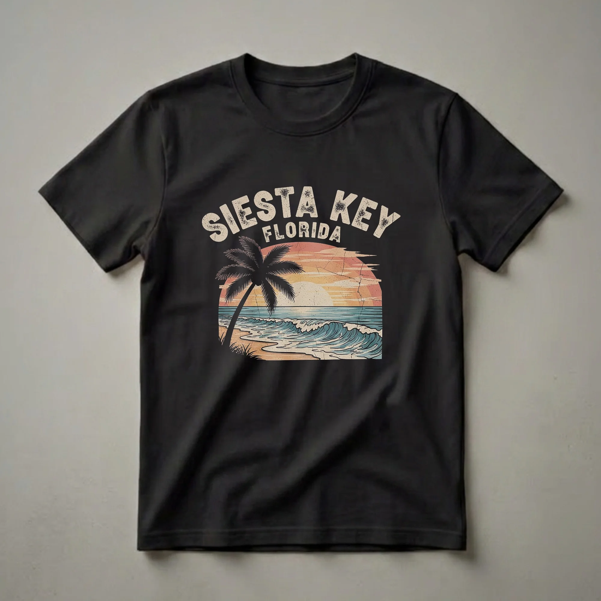 Siesta Key, Florida, is renowned for its powdery white sand beaches and vibrant sunsets, making it a dream destination for many. This graphic tee captures that iconic Florida vibe with a retro-inspired design. The artwork features a silhouetted palm tree leaning towards the ocean, with stylized waves crashing on the shore. Above the scene, the words "SIESTA KEY" are emblazoned in a distressed, bold font, with "FLORIDA" centered beneath it. The background depicts a colorful sunset with radiating lines and a textured, vintage feel, evoking the warm, tropical atmosphere of the Gulf Coast. This t-shirt is a thoughtful gift for anyone who has visited Siesta Key or dreams of experiencing its beautiful coastline. It's a staple for beach vacations, casual outings, or simply remembering sunny days. Wear this shirt to evoke memories of Florida's stunning natural beauty and laid-back lifestyle. It's a go-to tee for those who appreciate vintage travel aesthetics and coastal charm.