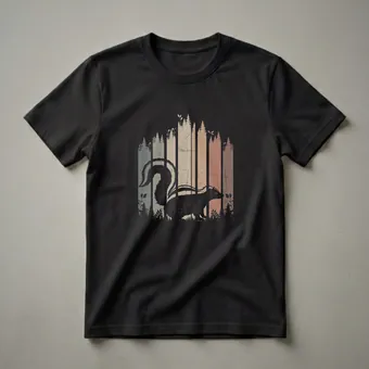 Wildlife enthusiasts and hikers will appreciate this striking graphic tee featuring a retro skunk in a stylized forest scene. The design showcases a black silhouette of a skunk with its iconic bushy tail, set against a backdrop of vertical stripes in muted, earthy tones like muted green, beige, and rust. These stripes are overlaid with a distressed texture, giving the artwork a vintage feel. Silhouetted pine trees and delicate foliage frame the scene, evoking a sense of being deep in the woods. Skunks, known for their distinctive black and white markings and their ability to spray a potent scent as a defense mechanism, are fascinating creatures often found in woodlands and meadows across North America. This shirt is a thoughtful gift for anyone who admires these unique mammals or enjoys the tranquility of nature. It's a go-to tee for casual outings, nature walks, or simply relaxing at home while celebrating the wild.