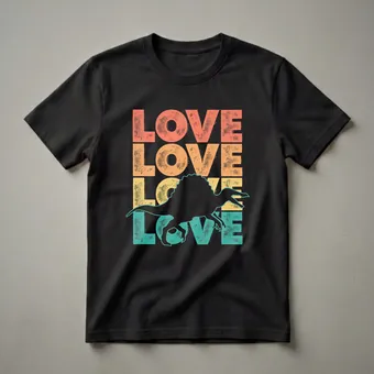 Dinosaur fans who want to wear their obsession with style will reach for this retro sunset graphic tee. The design stacks the word 'LOVE' four times vertically, each row in a different vintage color, coral red at the top, followed by orange, then yellow, then teal, giving the whole piece a warm retro sunset palette. Overlaid across the lower two rows of text is a bold black silhouette of a Spinosaurus, its distinctive elongated dorsal sail visible in crisp profile. Spinosaurus (Spinosaurus aegyptiacus) was one of the largest carnivorous dinosaurs ever discovered, estimated at 46 to 59 feet in length. It lived during the Cretaceous Period roughly 95 to 100 million years ago in what is now North Africa, and it is unique among large theropods for evidence suggesting it spent significant time in water, hunting fish rather than land prey. This shirt makes a thoughtful gift for paleontology enthusiasts, museum-goers, kids and adults who grew up obsessed with dinosaurs, and anyone who loves the combination of vintage graphic style with creature illustration. Wear it to a natural history museum visit, a casual weekend out, or game night with fellow prehistoric-life fans. The tee suits anyone who has a soft spot for ancient reptiles and retro design in equal measure.
