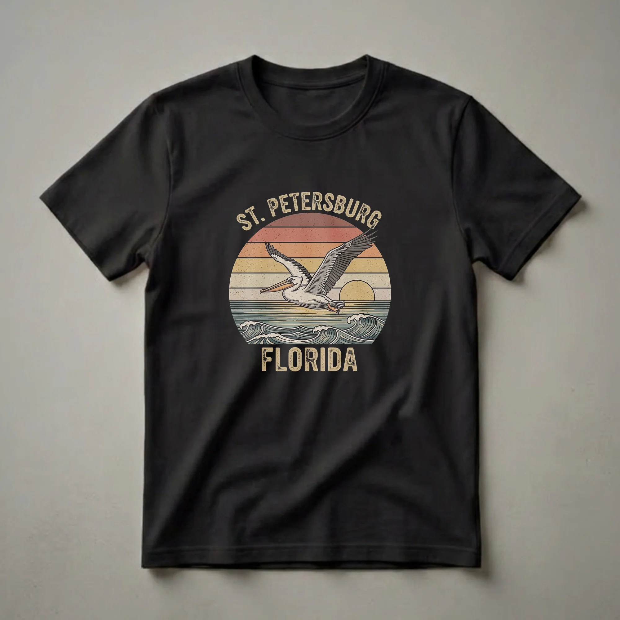 St. Petersburg, Florida residents and visitors who appreciate coastal vibes will reach for this retro-inspired graphic tee. The design features a striking pelican in mid-flight, wings spread wide, soaring over stylized ocean waves. Behind the bird, a vintage sunset with horizontal stripes in warm tones of orange, yellow, and brown creates a nostalgic backdrop. The text "ST. PETERSBURG" arcs above the scene, with "FLORIDA" prominently displayed below the waves. St. Petersburg, located on the Pinellas Peninsula between Tampa Bay and the Gulf of Mexico, is known for its beautiful beaches and abundant wildlife, including pelicans that are a common sight along its coastline. This t-shirt captures the essence of the city's relaxed, sun-drenched atmosphere. It makes a thoughtful gift for anyone who has visited or lived in St. Pete, or for those who dream of its sunny shores. Wear this shirt to the beach, on a casual outing, or while reminiscing about your Florida travels.
