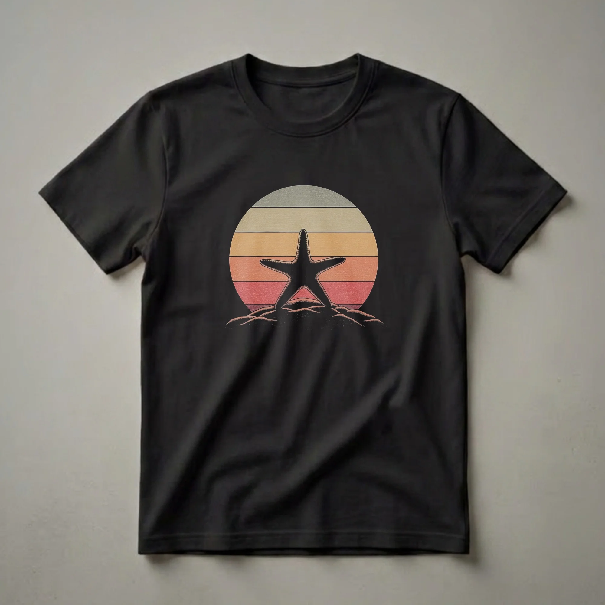 - Retro starfish sunset graphic tee for ocean enthusiasts.