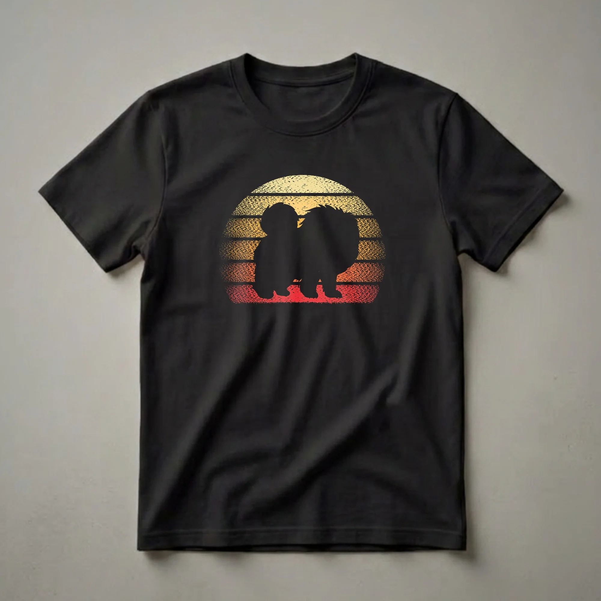 Dog lovers who adore their fluffy Chow Chows will be captivated by this t-shirt showcasing a vintage-inspired sunset graphic. The design features a bold black silhouette of a Chow Chow dog, complete with its distinctive mane and fluffy tail, set against a vibrant retro sunset. This sunset is rendered with horizontal stripes in warm hues of yellow, orange, and red, all textured with a distressed, grainy effect that evokes a nostalgic, 70s or 80s vibe. The Chow Chow, known for its lion-like appearance and deep blue-black tongue, originated in northern China, where it was used as a guard dog and for hunting. This t-shirt is a thoughtful gift for any woman or man who cherishes their Chow Chow companion. It's an eye-catching piece of apparel that stands out, making it a go-to tee for casual outings, dog park visits, or simply relaxing at home with your furry friend. Celebrate your bond with this unique dog-themed shirt.