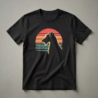- Retro sunset graphic tee for Irish Wolfhound lovers.