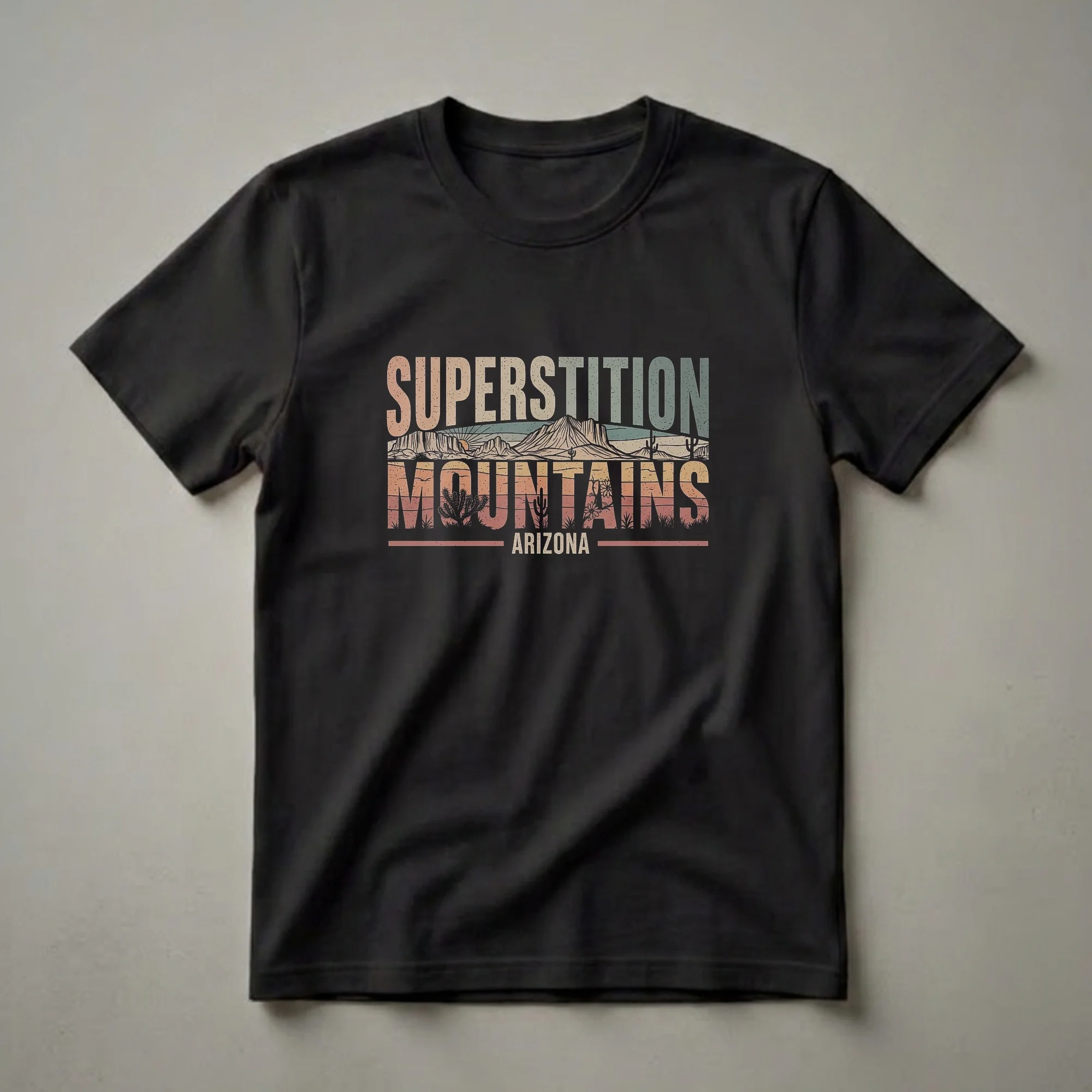 Arizona residents and desert explorers who appreciate the rugged beauty of the American Southwest will reach for this graphic tee. The design features a vintage-inspired illustration of the iconic Superstition Mountains, a prominent geological formation east of Phoenix, Arizona. This mountain range is known for its dramatic peaks and desert landscape, often depicted with saguaro cacti and other desert flora. The artwork captures a sunset scene, with warm, retro colors that evoke a sense of nostalgia for classic travel posters and vintage Americana. The text clearly labels the location as 'SUPERSTITION MOUNTAINS ARIZONA,' making it a clear statement piece for anyone who has visited or dreams of visiting this unique region. This shirt works well for casual wear, hiking trips, or as a memento of a trip to the Grand Canyon State. It makes a thoughtful gift for anyone who cherishes the unique landscapes and vibrant culture of Arizona, whether they are a long-time resident or a visitor captivated by its natural wonders. Wear this tee to remember your adventures in the Sonoran Desert.