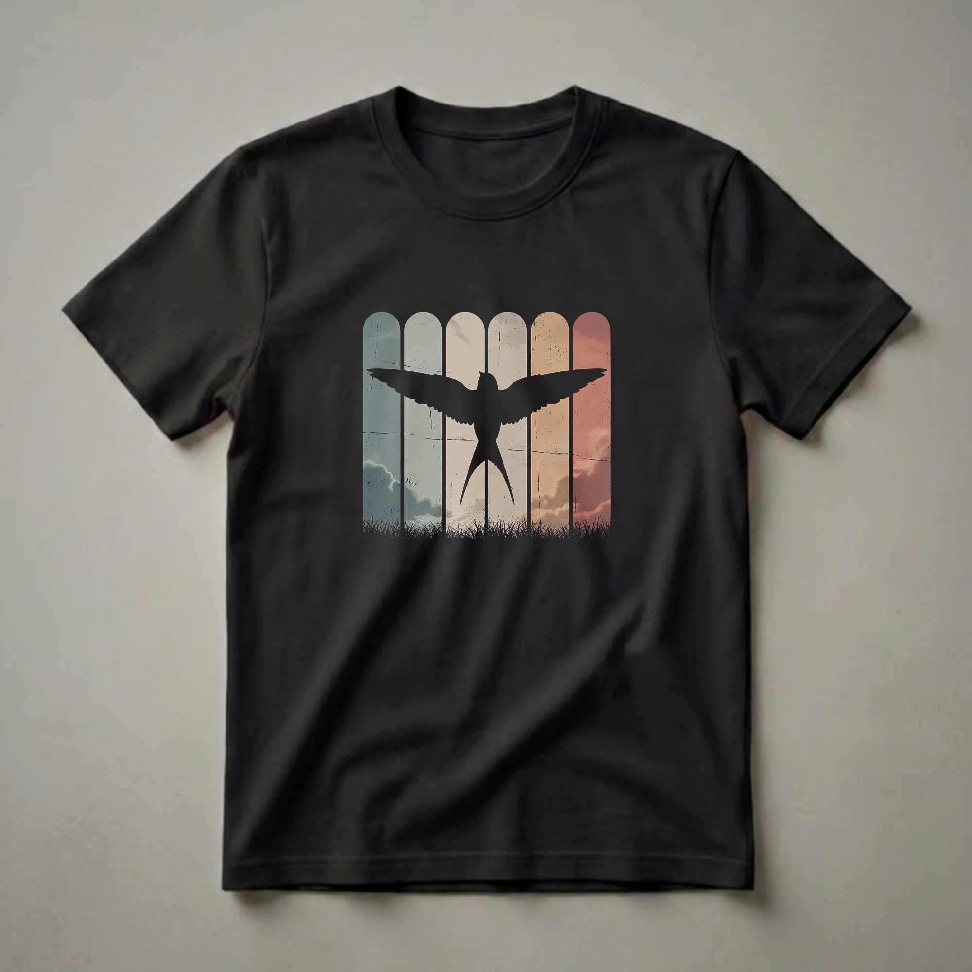 - Retro swallow silhouette tee with a vintage sunset design.