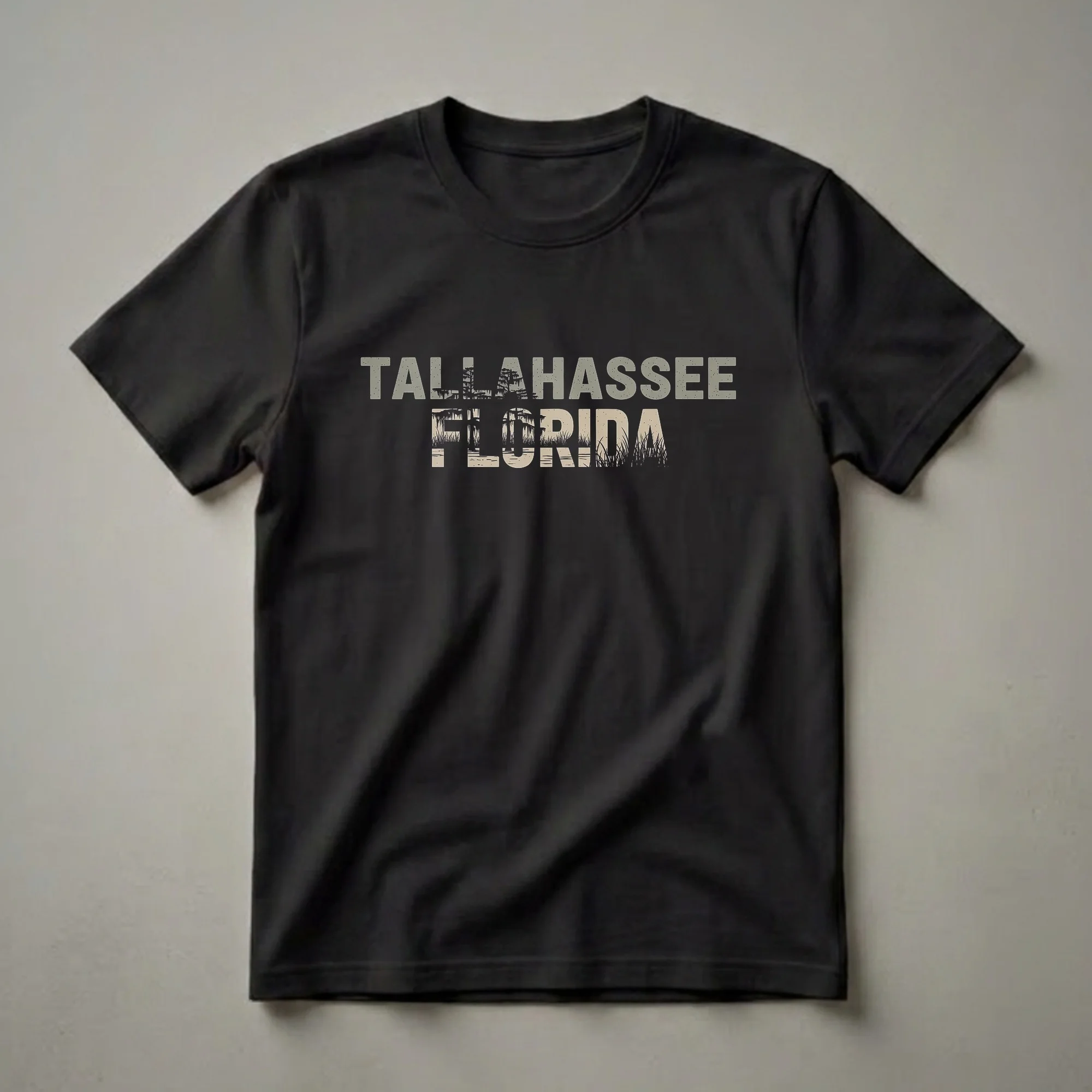 Tallahassee residents and visitors who appreciate the unique natural beauty of Florida will reach for this distinctive graphic tee. The design showcases the words "TALLAHASSEE FLORIDA" in a distressed, retro font, with a captivating silhouette of a swampy landscape filling the letters. This scene evokes the iconic imagery of Spanish moss-draped cypress trees and marshy grasses characteristic of the Florida Panhandle. Tallahassee, the state capital, is known for its rolling hills and abundant natural areas, including state parks and Apalachicola National Forest, offering a different kind of Florida experience than the coastal beaches. This shirt serves as a wearable reminder of the city's natural charm and its status as a hub for outdoor enthusiasts. It makes a thoughtful gift for anyone who has lived in, visited, or has a special connection to Tallahassee. Wear this tee to casual outings, exploring local parks, or while reminiscing about your Florida adventures. This comfortable shirt is a staple for any Florida travel collection.