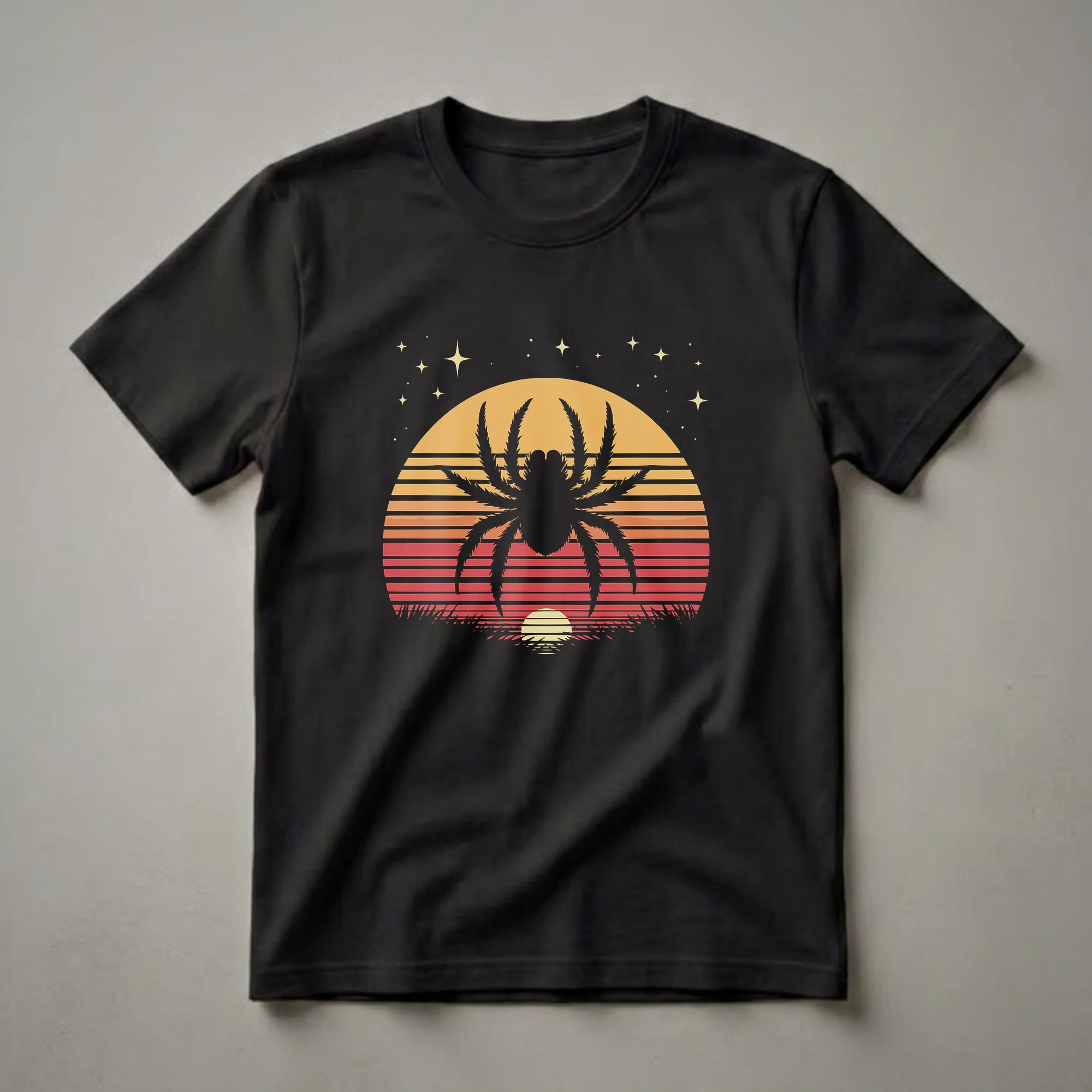 Arachnid enthusiasts and lovers of vintage aesthetics will appreciate this striking graphic tee. The design features a bold, black silhouette of a tarantula spider prominently displayed against a vibrant retro sunset. This sunset is rendered with horizontal stripes in warm hues of orange, yellow, and red, evoking a nostalgic, 80s vibe. Above the sunset, a scattering of stylized stars adds a celestial touch to the night sky. In the foreground, silhouetted blades of grass and a hint of foliage ground the scene, while a smaller, stylized sun reflects on the water below the horizon. Tarantulas, known for their impressive size and hairy appearance, are fascinating creatures that play a vital role in their ecosystems, often found in diverse habitats ranging from deserts to rainforests. This t-shirt makes a thoughtful gift for anyone who admires these eight-legged wonders or enjoys unique, retro-inspired apparel. It's a go-to tee for casual outings, nature walks, or simply expressing a love for the unconventional.