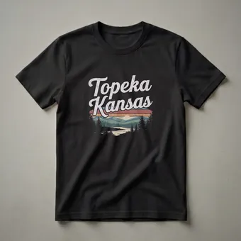 - Topeka, Kansas capital city graphic tee with a distressed, vintage font and scenic landscape.