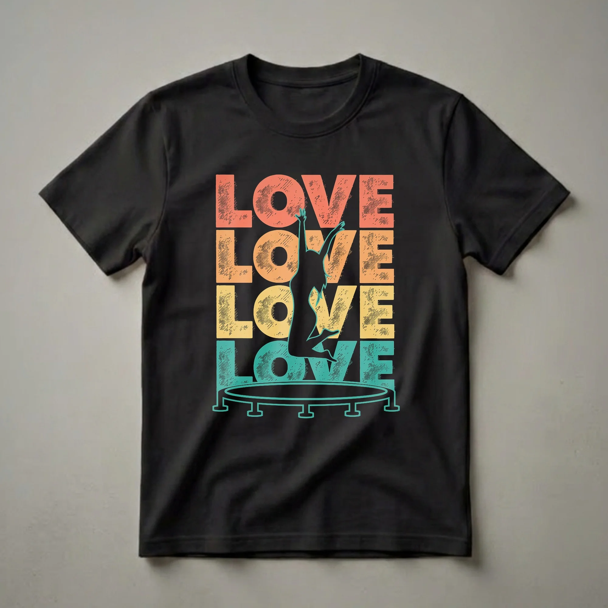 Trampoline enthusiasts who love to soar will reach for this eye-catching graphic tee. The design features the word 'LOVE' repeated in a vibrant, retro-style font, with a silhouette of a person mid-jump on a trampoline. This shirt celebrates the joy and exhilaration of bouncing. Trampolining, a sport that requires balance, coordination, and strength, has roots in circus acrobatics and became a competitive Olympic sport in 2000. This t-shirt is a thoughtful gift for anyone who finds their passion in the air, whether they are a seasoned competitor or enjoy casual bouncing. It's a great way for women who love trampolining to express their enthusiasm. Wear this tee to your next trampoline park visit or to casual gatherings with fellow athletes. It’s a staple in the collection for anyone who loves the feeling of defying gravity. This shirt is a fun way to showcase your dedication to the sport and the pure love of bouncing.
