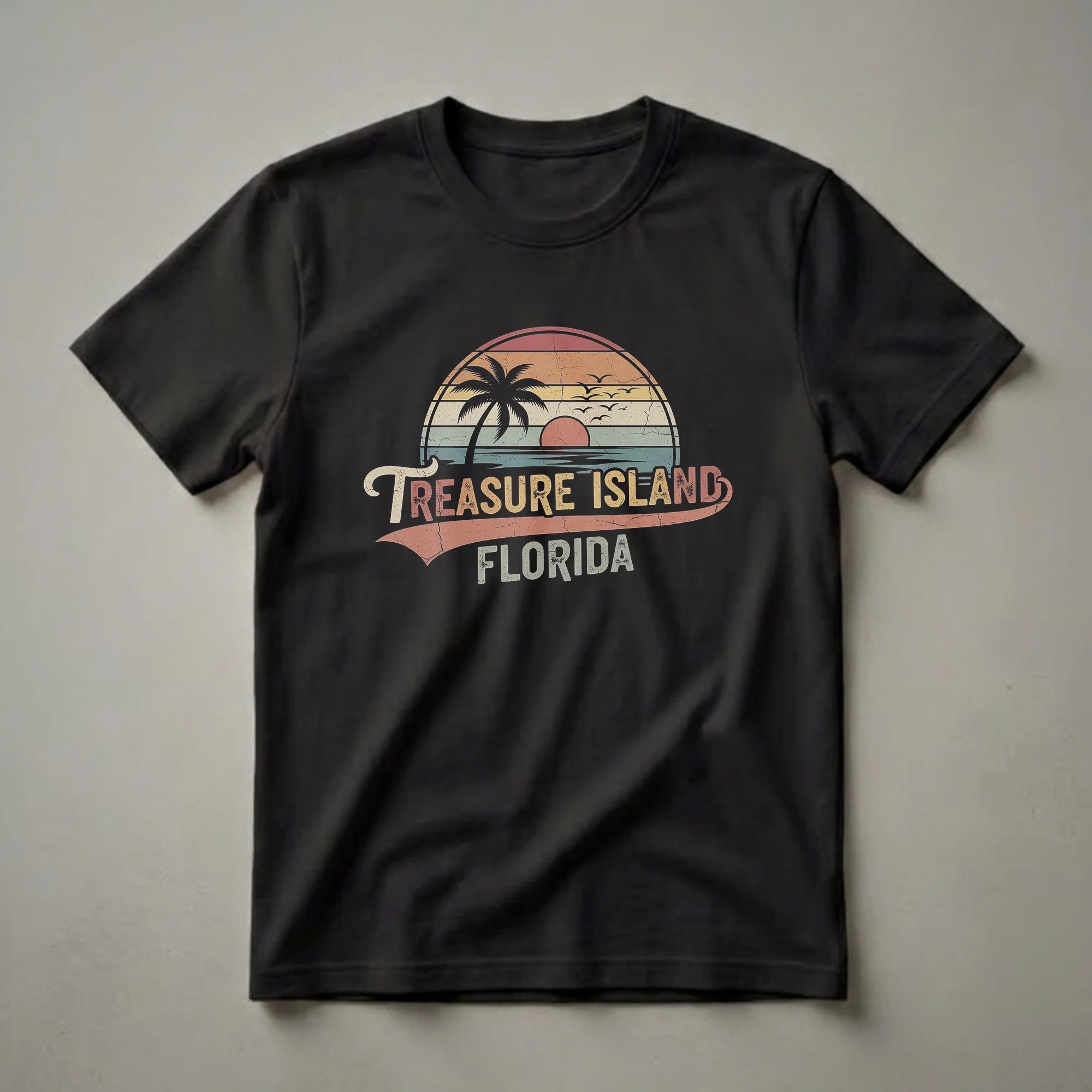 Treasure Island, Florida, a barrier island on the Gulf Coast, is known for its beautiful beaches and laid-back atmosphere. This retro-inspired graphic tee captures that essence with a vintage sunset design. The artwork features a stylized sun setting over the ocean, with silhouetted palm trees and a flock of seagulls in flight. The design is rendered in a classic retro color palette of muted reds, oranges, yellows, and blues, with a distressed texture that evokes a sense of nostalgia. The words "Treasure Island" are emblazoned across the front in a bold, flowing script, followed by "FLORIDA" in a blocky, vintage font. This t-shirt is a thoughtful gift for anyone who has fond memories of visiting or living in Treasure Island, or for those who dream of a Florida beach vacation. It's a staple in the collection for those who appreciate vintage travel aesthetics and coastal charm. Wear this shirt to the beach, on a casual outing, or while reminiscing about sunny days on the Gulf Coast. It's a great way to showcase your love for this unique Florida destination.