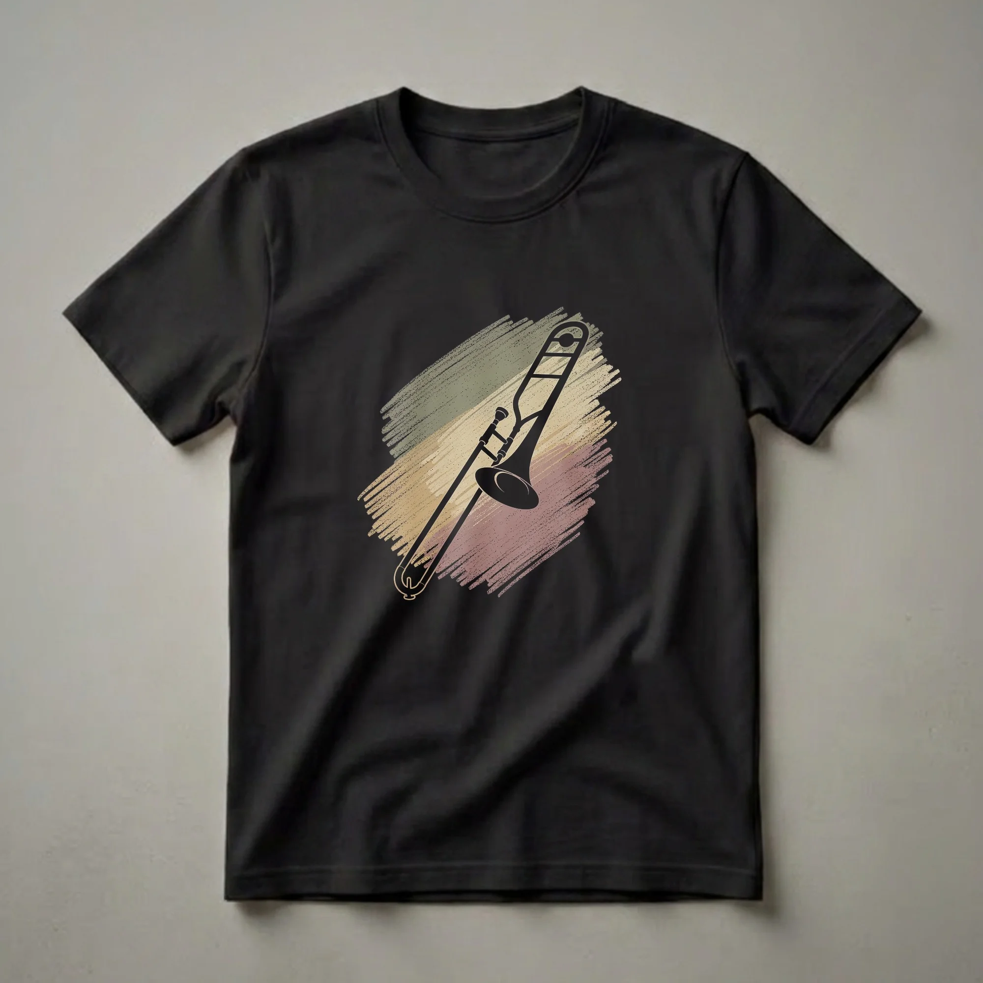 Brass musicians who appreciate vintage aesthetics will reach for this striking trombone tee. The design features a bold, black silhouette of a tenor trombone, complete with its characteristic slide and bell, set against a backdrop of distressed horizontal stripes in muted tones of olive green, tan, and mauve. This artistic representation evokes a sense of nostalgia, reminiscent of classic concert posters or album art. The trombone, a member of the brass instrument family, is known for its versatile sound, capable of producing both powerful fanfares and smooth, lyrical melodies. It's a staple in orchestras, jazz ensembles, and marching bands alike. This t-shirt is a thoughtful gift for any trombonist, whether they are a seasoned professional, a dedicated student, or a passionate hobbyist. It's great to wear to band practice, rehearsals, concerts, or simply as a casual statement piece that celebrates their musical passion. This graphic shirt is a unique way for any brass player to express their dedication to their instrument.
