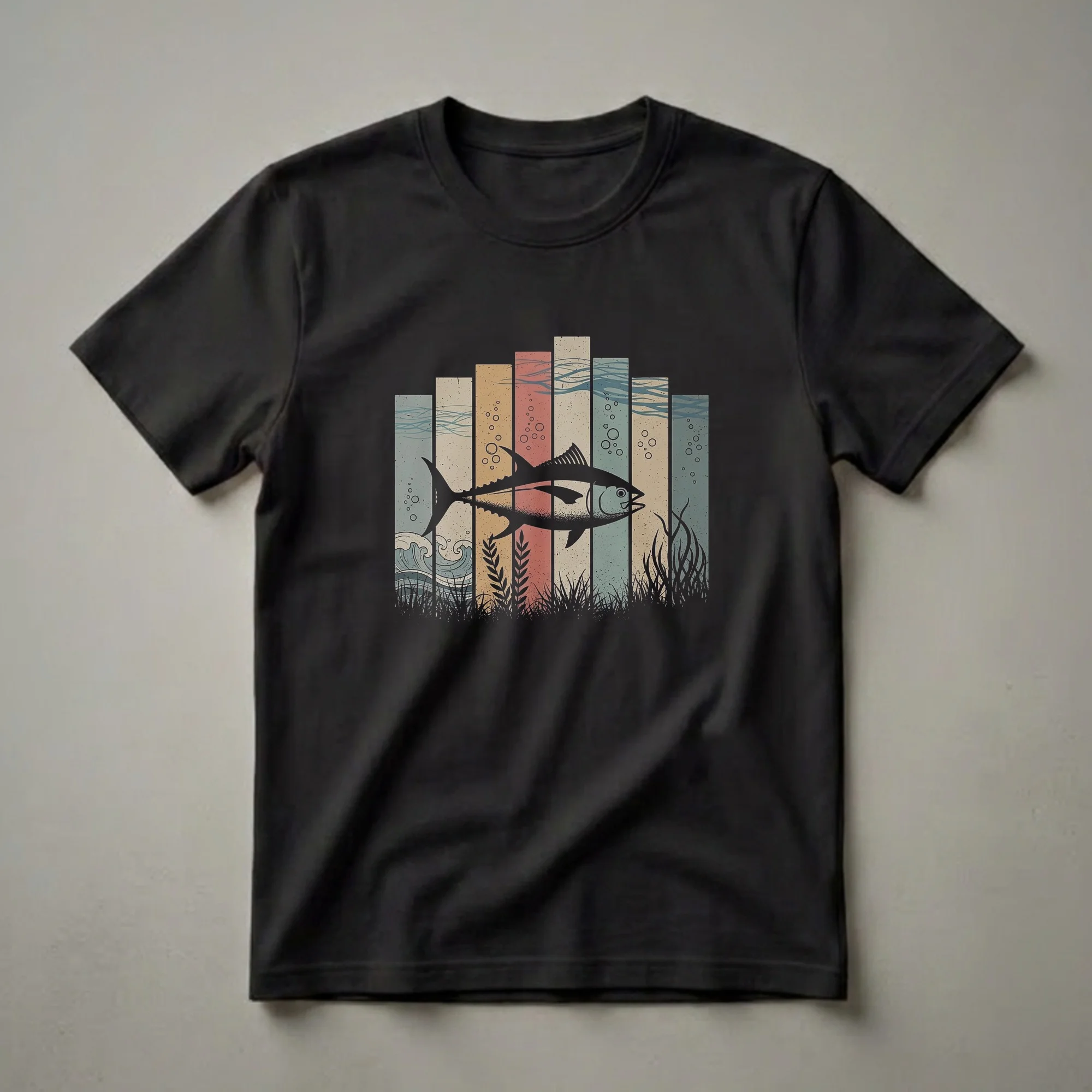 Anglers who appreciate the sport of fishing will reach for this striking graphic tee. The design features a bold silhouette of a tuna, a powerful and fast-swimming pelagic fish known for its speed and endurance in the open ocean. This shirt captures the essence of a deep-sea fishing adventure with its retro-inspired vertical stripes in muted, earthy tones, evoking the feeling of being underwater. Bubbles rise from the ocean floor, where stylized waves and aquatic plants add to the underwater scene. Tuna are migratory fish found in temperate and tropical oceans worldwide, often targeted by sport fishermen for their size and fight. This t-shirt makes a thoughtful gift for the fisherman in your life who dreams of reeling in a trophy catch. Wear this tee on your next fishing trip or to your favorite casual hangout.